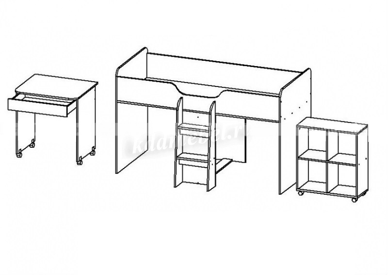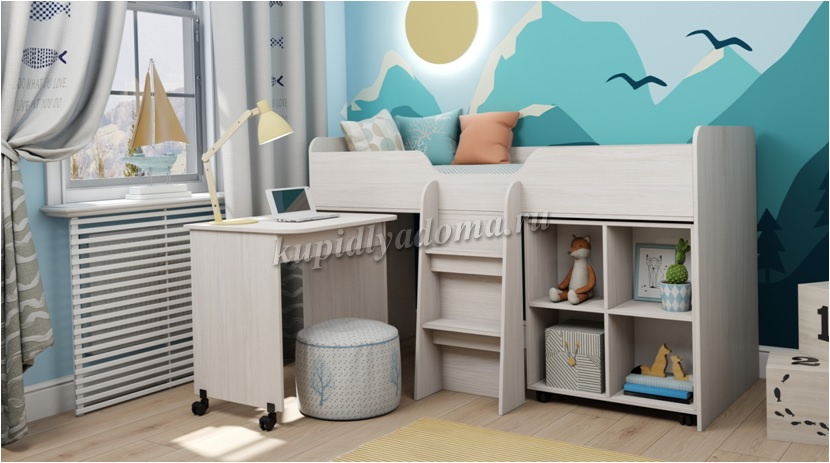 Очаровательная кровать-чердак для детской комнаты позволит решить вопрос организации пространства в небольшой детской комнате. Конструкция представляет собой отличную зону, включающую: выкатной стол с выдвижным ящиком и выкатной стеллаж.