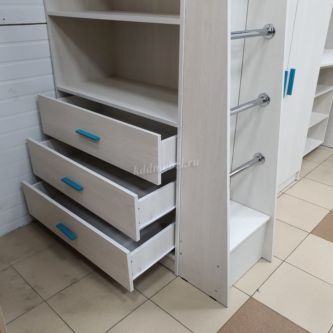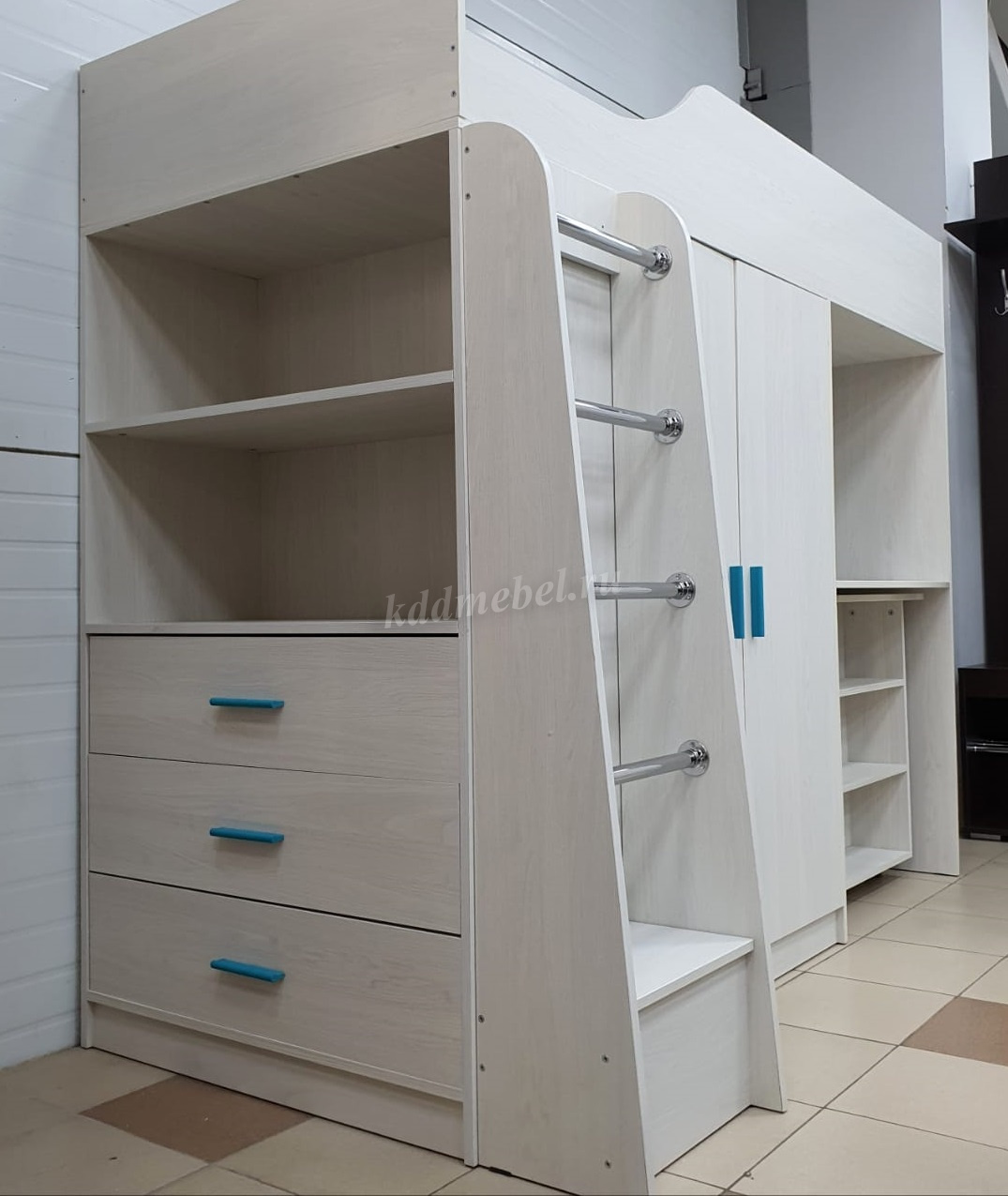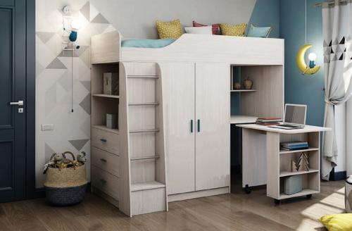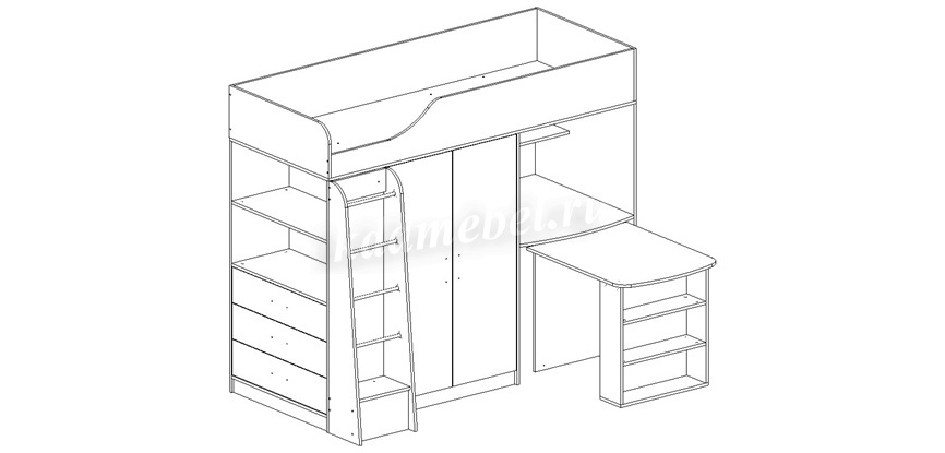 Многофункциональный комплекс "Каприз-8" подарит вашему ребенку идеальное место для сна, игр и творчества. Модель представляет собой союз самых важных элементов, которые необходимы для полноценной жизнедеятельности: кровать; шкаф с тремя полками по задней стенке, впереди штангой; письменный стол с полками; комод с тремя выдвижными ящиками и стеллаж.