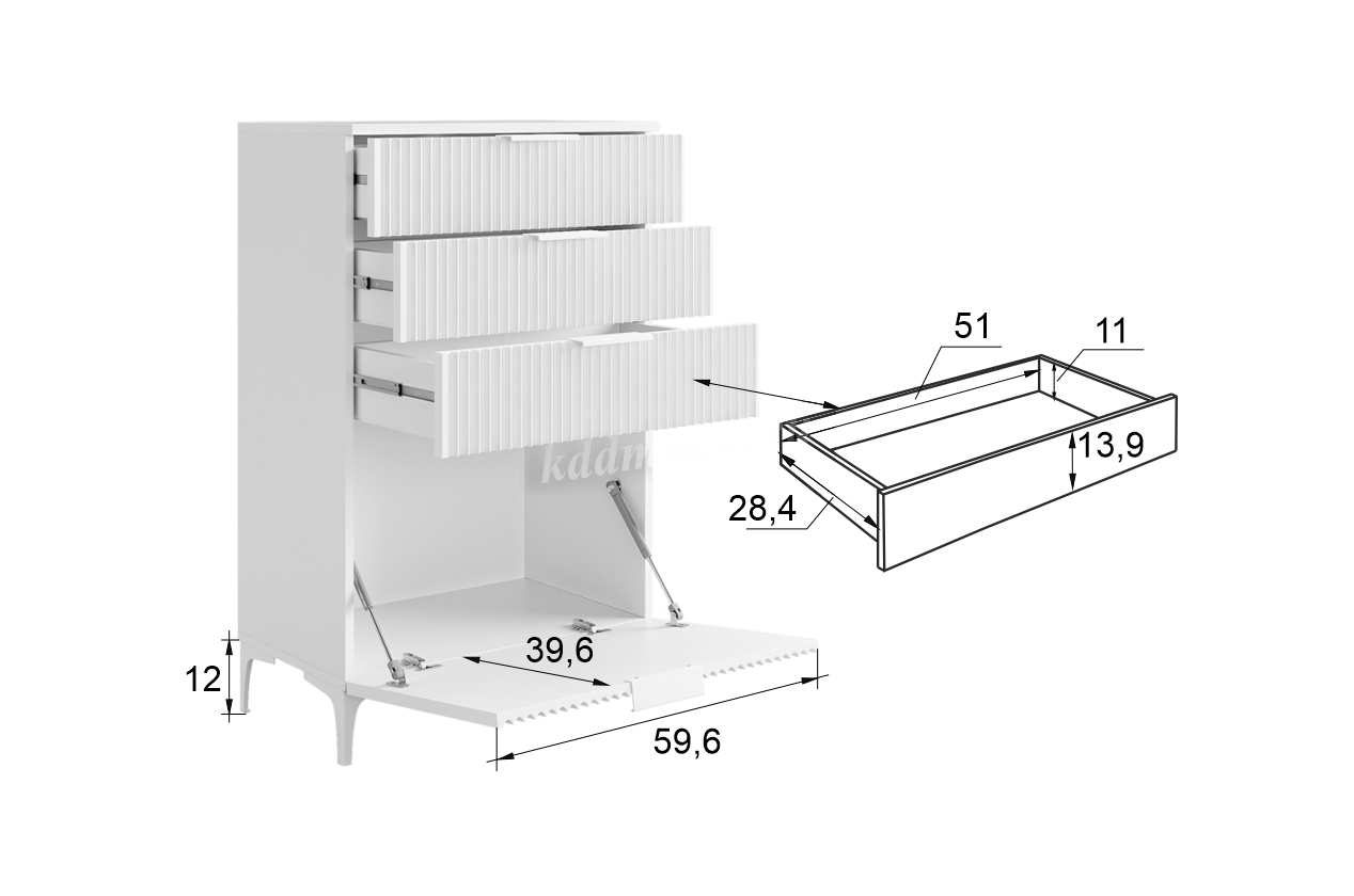 Состоит из: 3-х ящиков и нижней откидной барной секции.