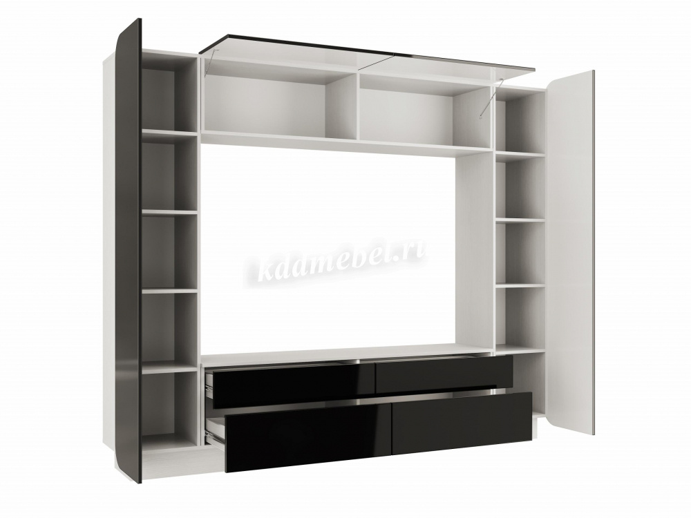 Внизу имеется четыре вместительных выдвижных ящика (комплектуются шариковыми направляющими) и два больших отделения вверху (комплектуются газлифтами) В каждой боковой секции по пять полок. Все дверцы, кроме верхних оснащены толкателями. Цветовые решения в белом и черном глянце придают гостиной отличный внешний вид, подходящий для любого оттенка интерьера