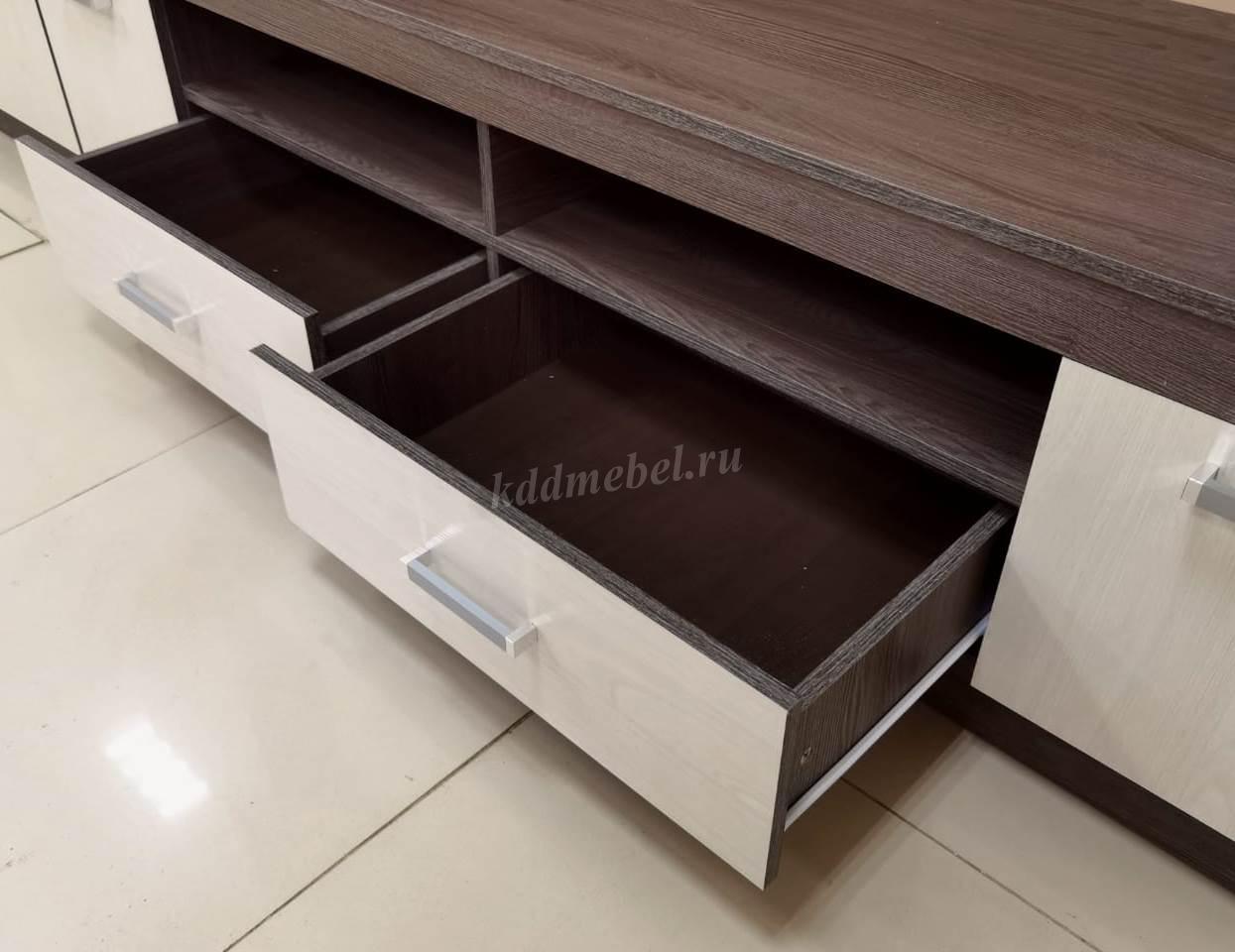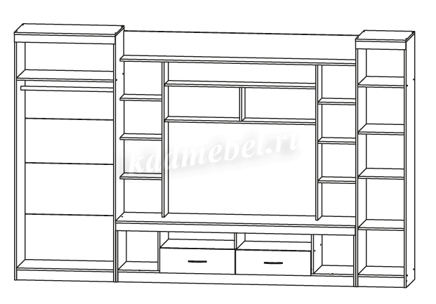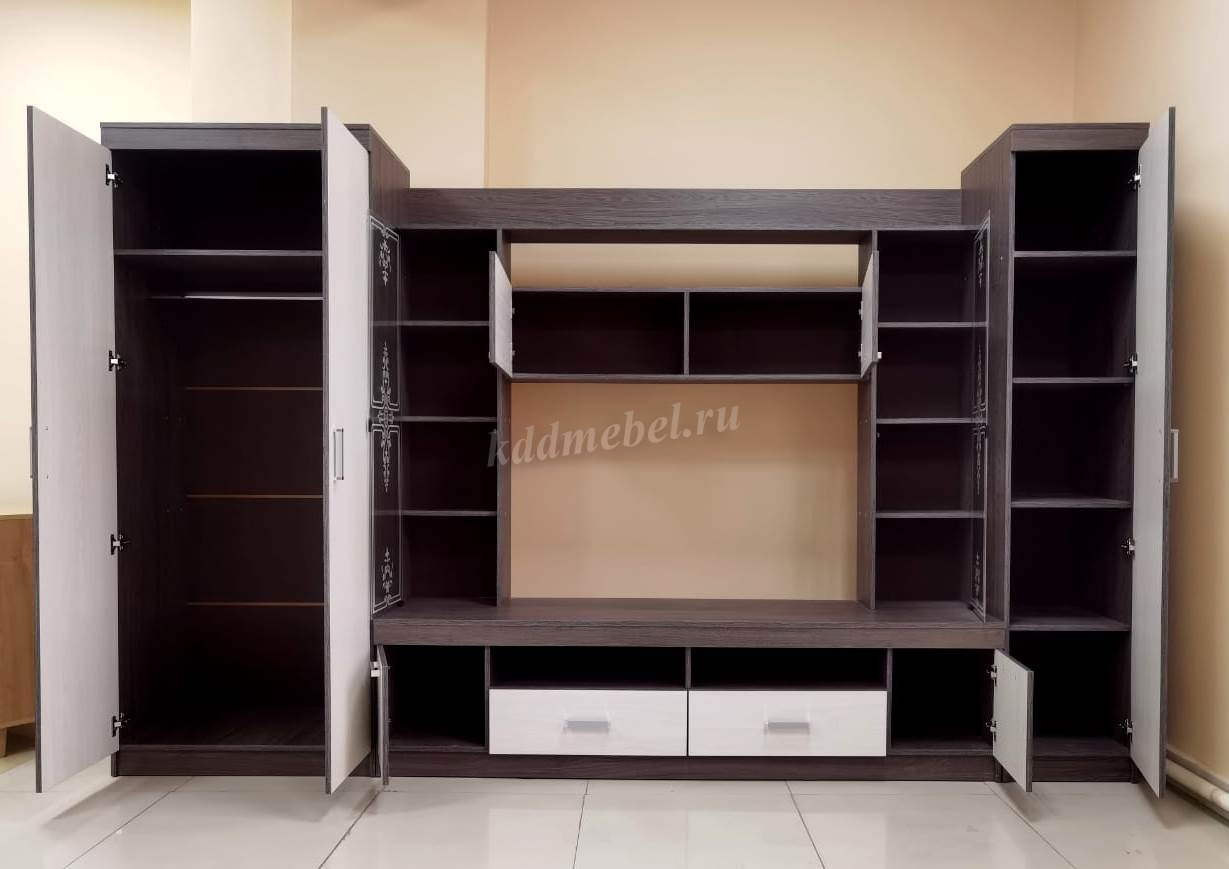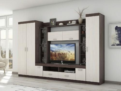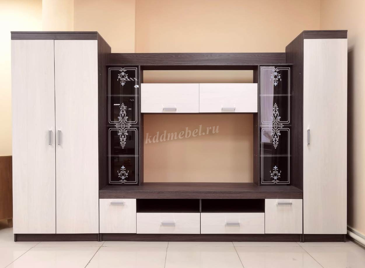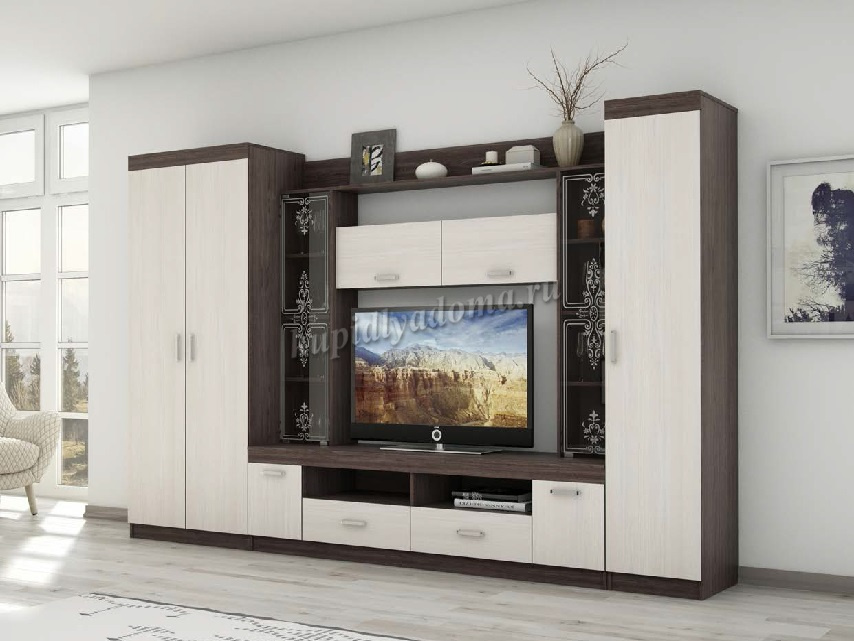 Компактная и функциональная стенка не только украсит гостиную, но и позволит аккуратно разложить и расставить десятки вещей. В центре стенки разместится большой телевизор – он станет главным визуальный акцентом композиции. Симметричный дизайн и сочетание контрастных оттенков цвета такая модель стенки легко впишется практически в любую обстановку.