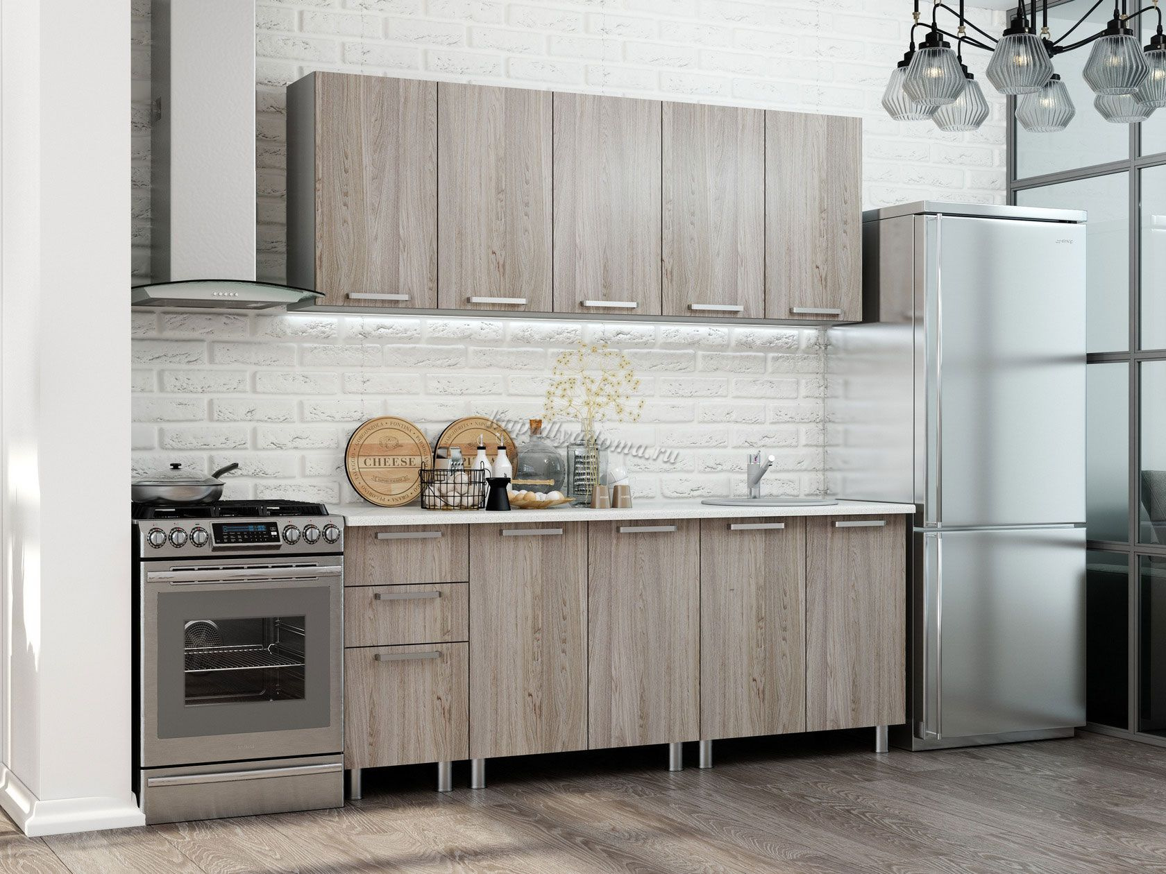 Кухня Эко 200 см выполнен в стильном древесном оттенке с фактурой, что создает атмосферу домашнего тепла и уюта. Универсальный дизайн комплекта позволяет ему вписаться практически в любой интерьер.