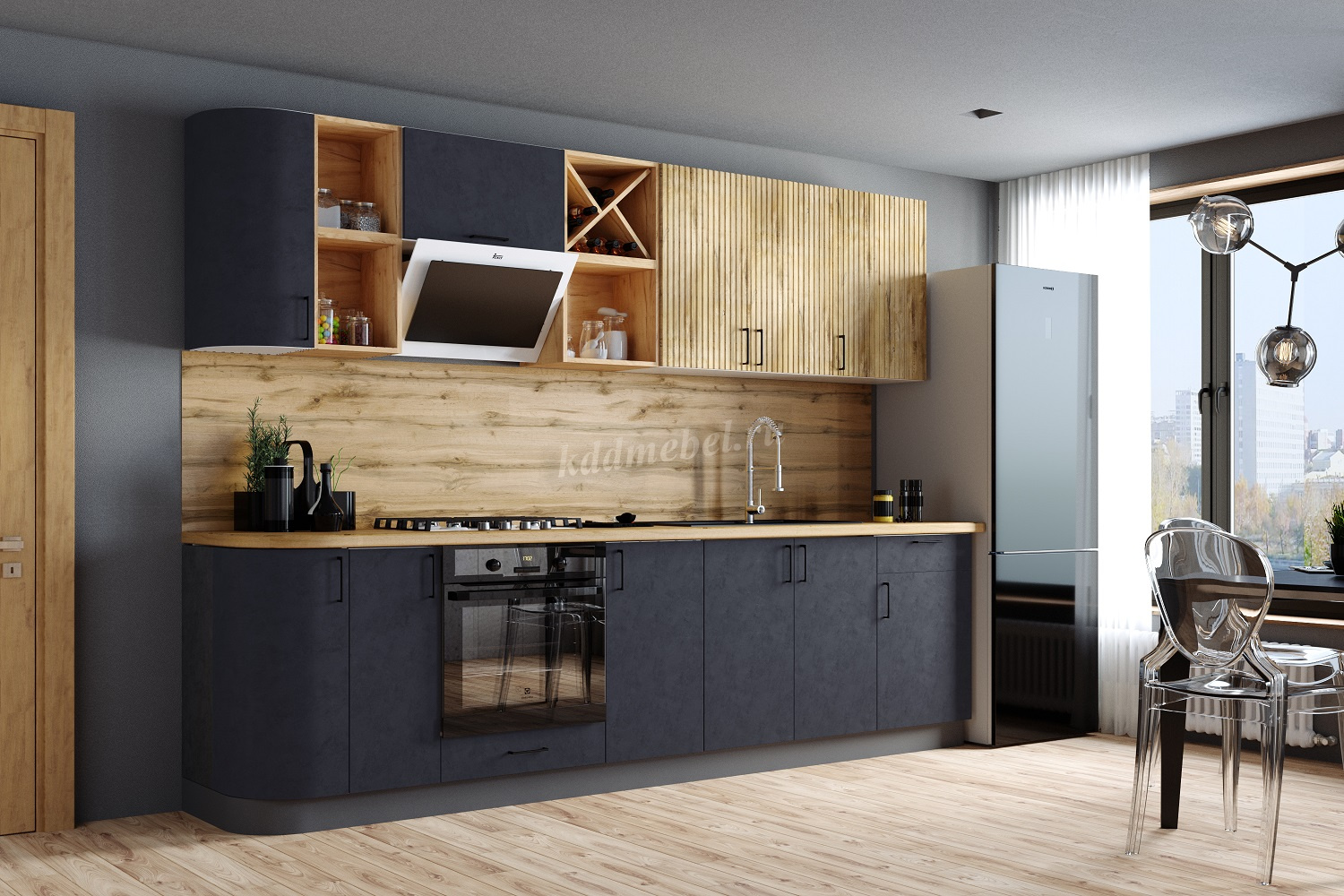— Рельефные фасады: глухие, не радиусные, в цветах «Дуб Канадский» и «Бетон Светлый». Доступны к заказу только для верхних вертикальных модулей
