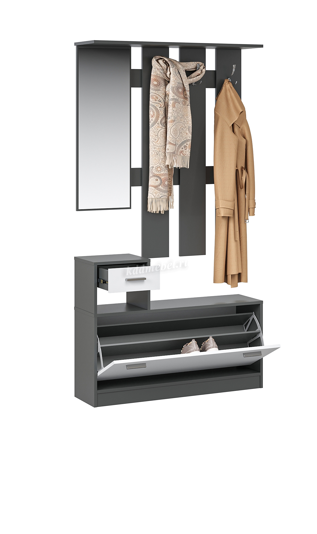 Интер – современная прихожая в стиле минимализм - минимум декора, максимум функционала. Компактная и вместительная, с небольшой глубиной – она поможет правильно организовать пространство в небольшом помещении. Прихожая включает в себя необходимые модули: вешалка с крючками, вместительные обувницы, выдвижные ящики для мелочей, зеркало.