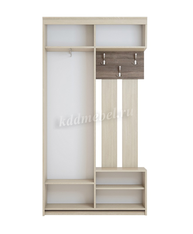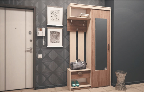 Компактная, но функциональная прихожая создана для тех, кто ценит пространство. Прихожая оснащена всем необходимым для Вашего комфорта: вместительным шкафом с кронштейном для одежды на плечиках, открытой вешалкой с трёхрожковыми крючками, выкатным ящиком под важные мелочи, верхней нишей для головных уборов, снизу небольшой открытый отсек для размещения обуви.