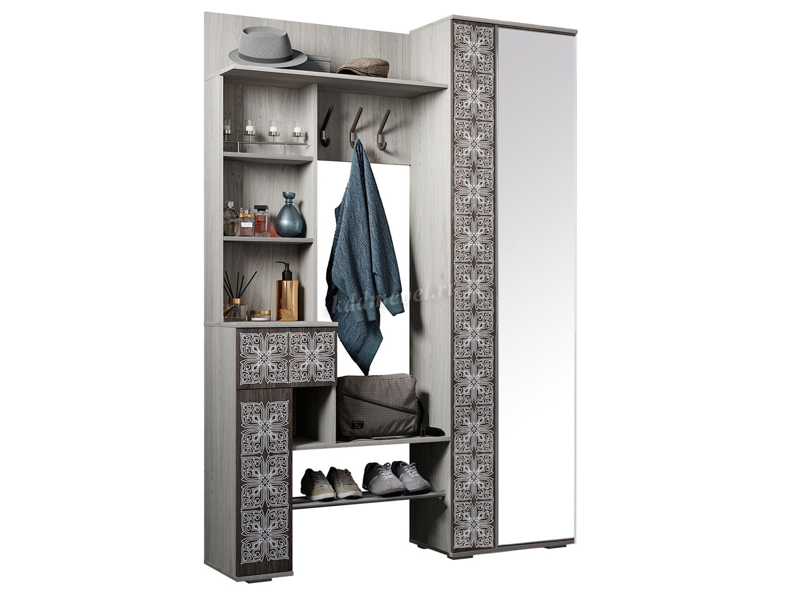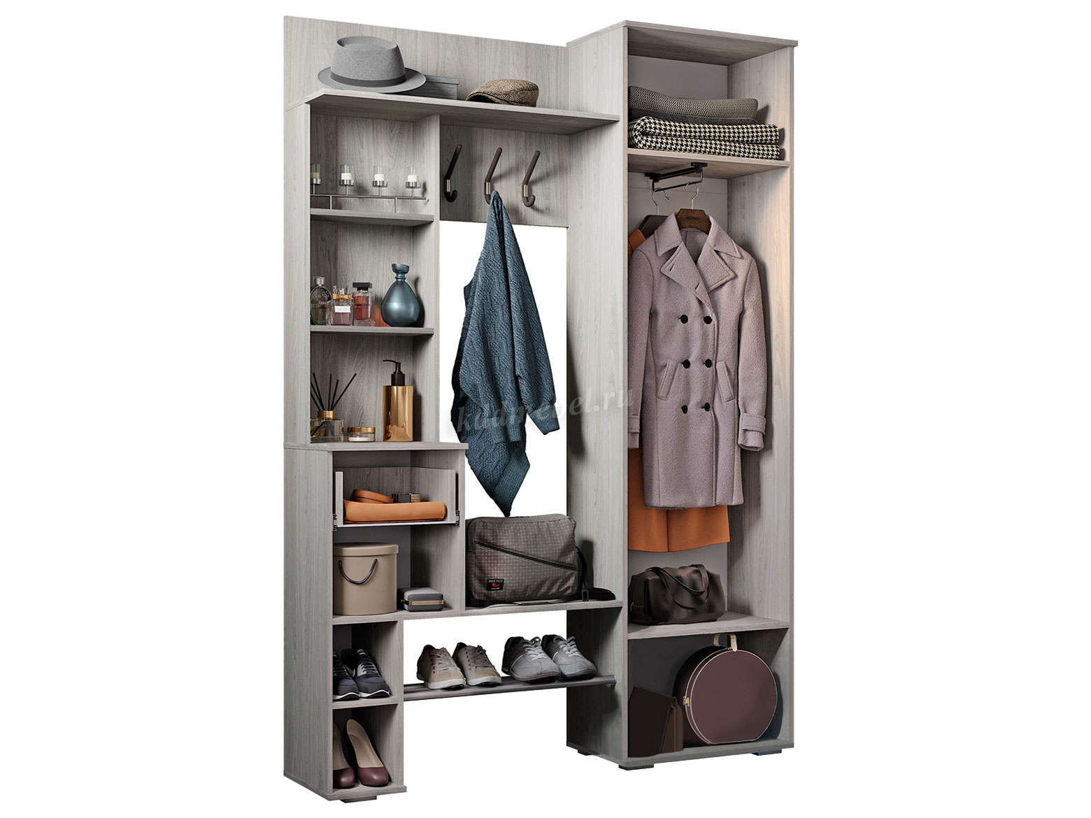 Стильный дизайн, четкость и лаконичность линий, гармоничное сочетание темных и светлых фактур - здесь есть все, чтобы подчеркнуть свою индивидуальность и безупречный вкус. Дополнительным удобством в использовании послужит открытая обувница и возможность сборки модели как на левую, так и на правую сторону.