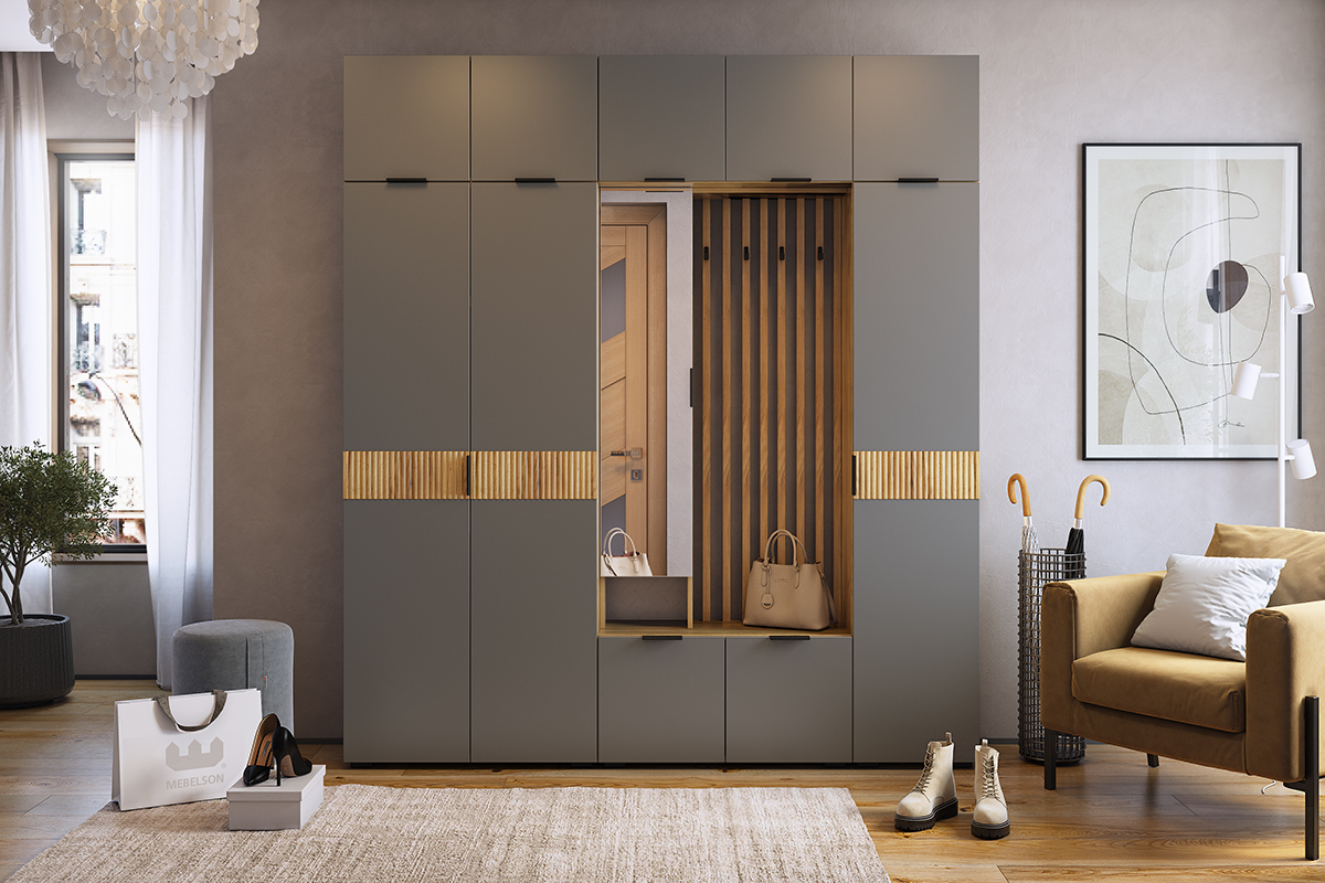 Стильные, трендовые рейки МДФ, акцентные крючки, зеркало, в котором можно себя увидеть в полный рост, полки для мелочей и головных уборов, а так же внизу большой шкаф для обуви, самые актуальные и ценные моменты в прихожей. Прихожая "Бери" можно поставить, как самостоятельное изделие или дополнить шкафами и антресолями из серии "Бери".