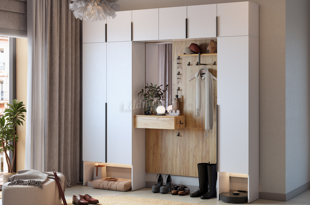 Принт, имитирующий вертикальную фрезеровку, придает зеркалу уникальный и современный вид, добавляя текстуру и глубину. Крючки предоставляют удобное место для хранения сумок или аксессуаров. Выкатной ящик служит дополнительным пространством для хранения мелочей, таких как ключи, кошелек, косметика или другие небольшие предметы.