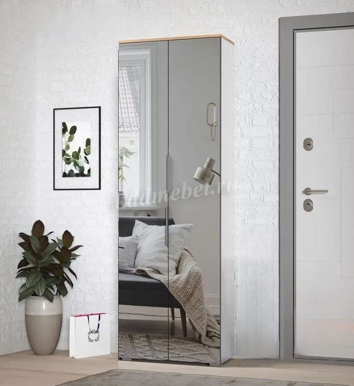 Зеркальные створки шкафа визуально расширяют пространство, а минималистичные алюминиевые ручки подчеркивают легкость и простоту линий.
