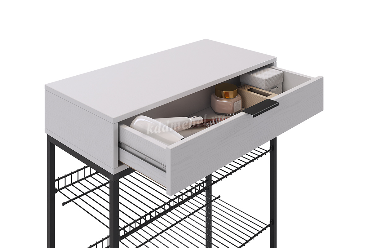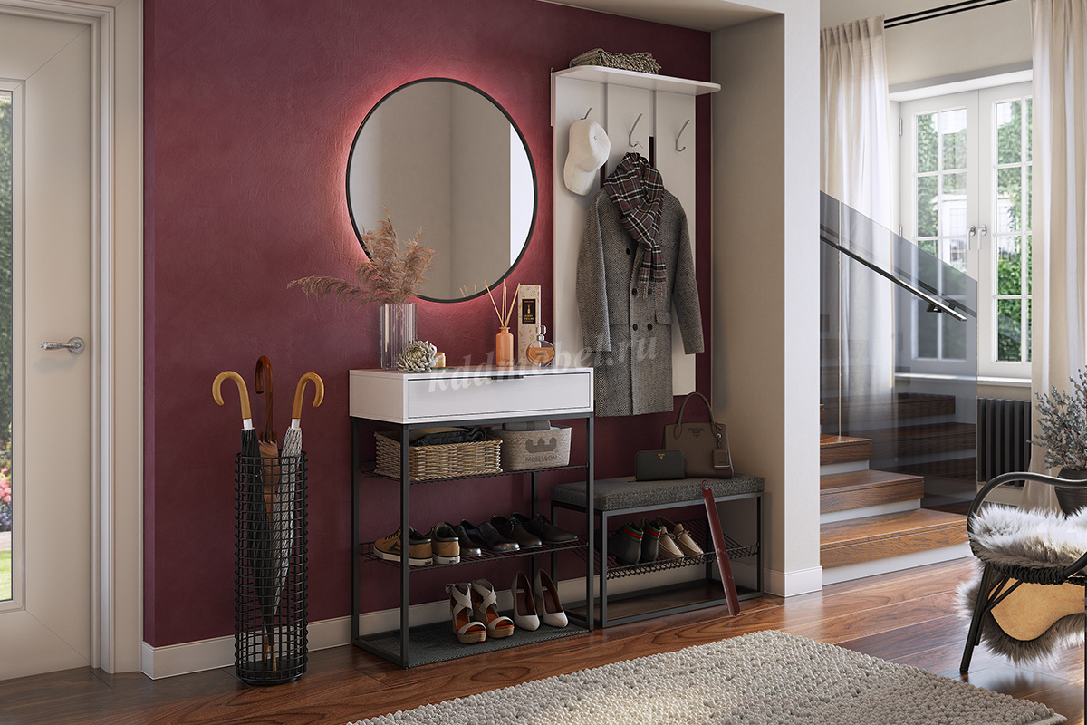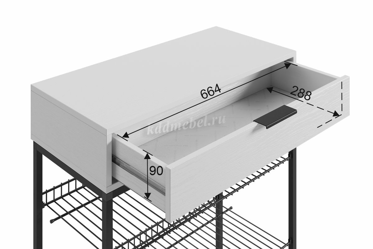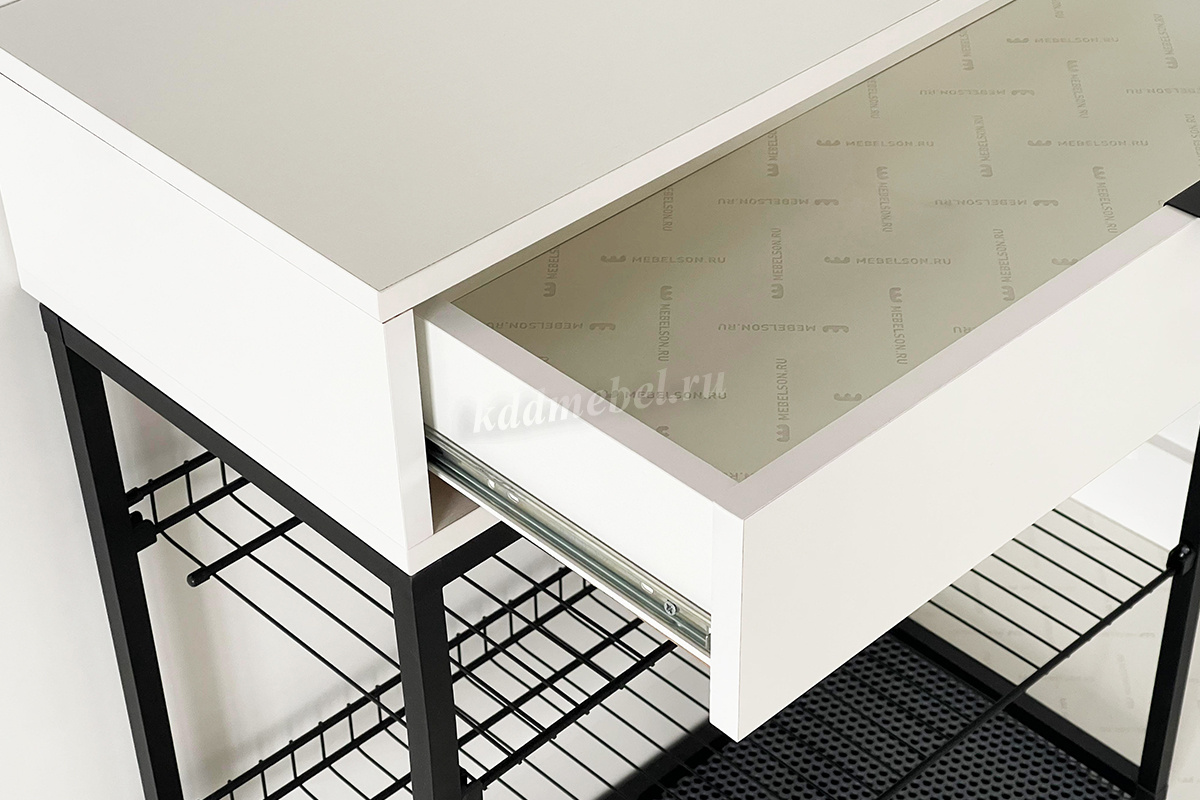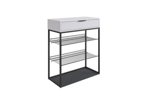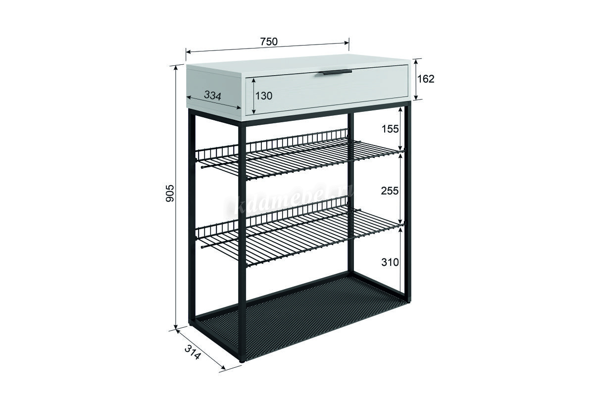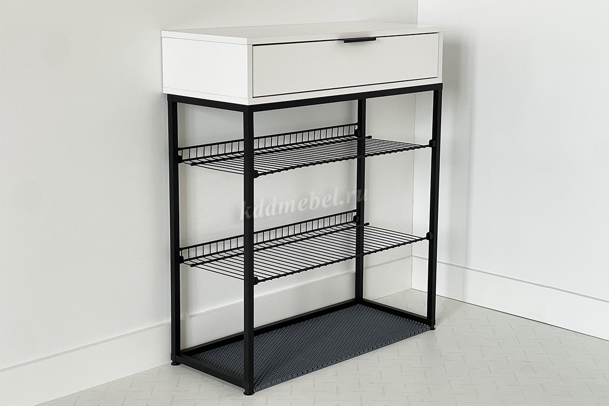 Модная консоль для обуви в стиле Лофт из металлического профиля, легкая. На 2-е съемные полки для обуви и эва коврик входит 12 пар обуви. Сотовые полки расположены горизонтально, благодаря этому, можно разместить на полках обувь и любые коробки для хранения функциональных мелочей. Задний бортик сотовых полок защитит стену от загрезнений. Обувница компактная и функциональная, поместится в любой прихожей, а разместив над обувницей зеркало, ее можно использовать, как трюмо. В выдвижном ящике на шариковых направляющих поместятся много полезных мелочей: фен, расчески, средства для чистки обуви и другие предметы. Ящик открывается с помощью стильной металлической ручки-профиля. Регулируемые опоры позволят скомпенсировать неровности пола. Эва коврик входит в комплект обувницы, убережет ваш пол