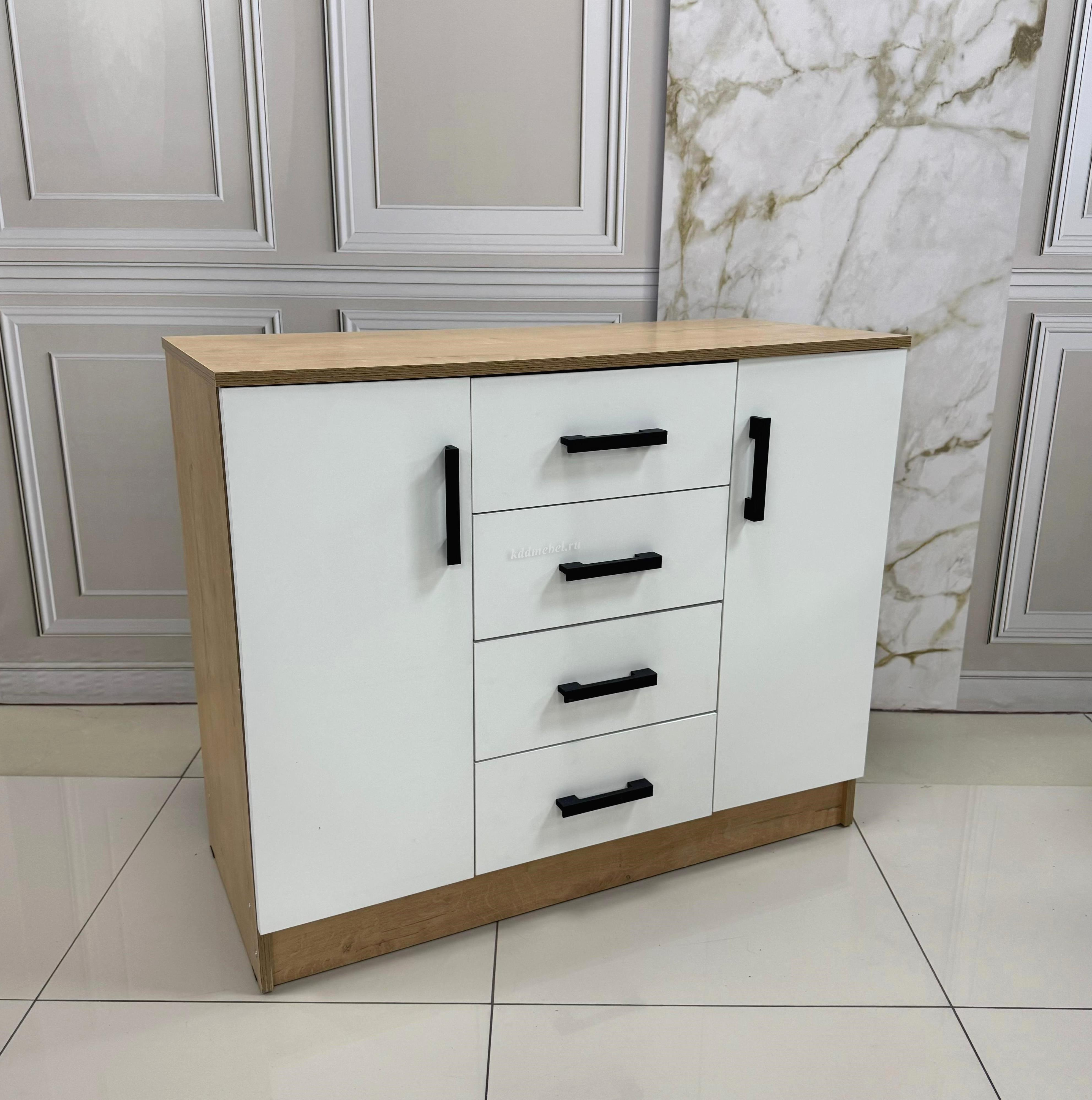 Имеет четыре выдвижных ящика и вместительные ниши за распашными дверцами.