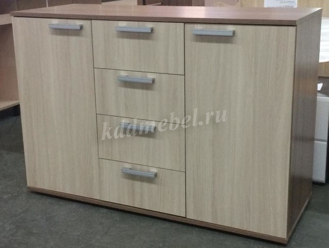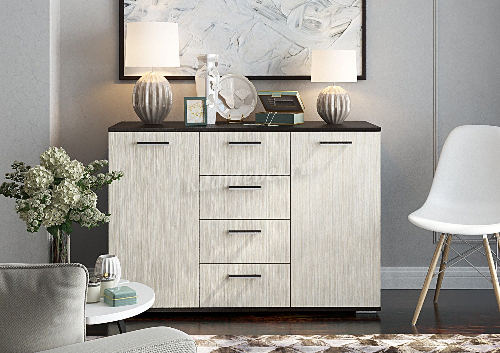 Комод имеет два больших отделения за распашными дверцами, разделенные внутри на 2 просторные полки. Посередине модели расположены четыре выдвижных ящика для разных мелочей. Дверцы открываются в сторону. Ящики выдвигаются на себя.Изделие выполнено в изящном лаконичном дизайне.