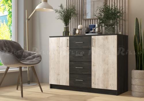 Комод имеет два больших отделения за распашными дверцами, разделенные внутри на 2 просторные полки. Посередине модели расположены четыре выдвижных ящика для разных мелочей. Дверцы открываются в сторону. Ящики выдвигаются на себя.