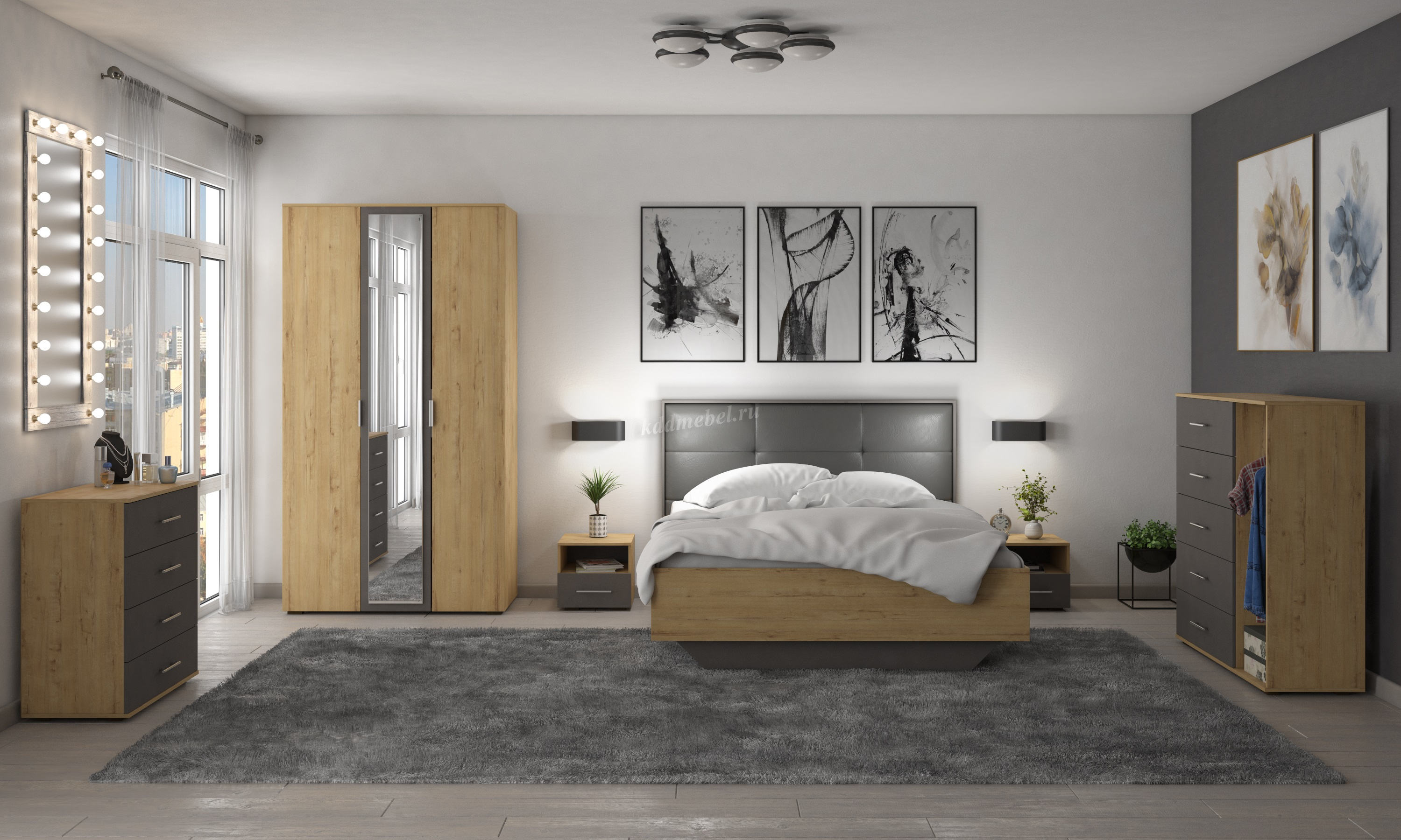 Тщательно продуманный дизайн - это гарантия уюта и комфорта в доме. Именно поэтому мебель для спальни необходимо выбирать с особым вниманием, она должна быть не только красивой, но и функциональной, так же надежной. Главное преимущество модульных комплектов - все предметы можно приобрести по отдельности. В спальном гарнитуре "Бруно" используем два вида материала для основных элементов ЛДСП и для декора кровати у изголовья мягкую отделку. Кровать является центром любой спальни.
