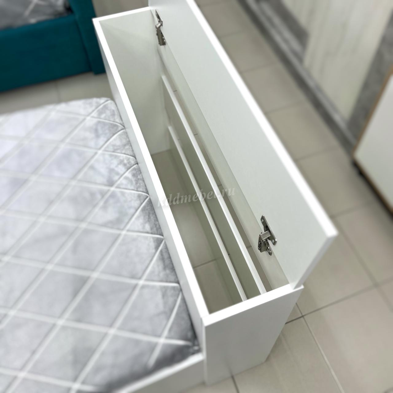 Сверху в изголовье открывается фасад на петлях и расположено место для хранения