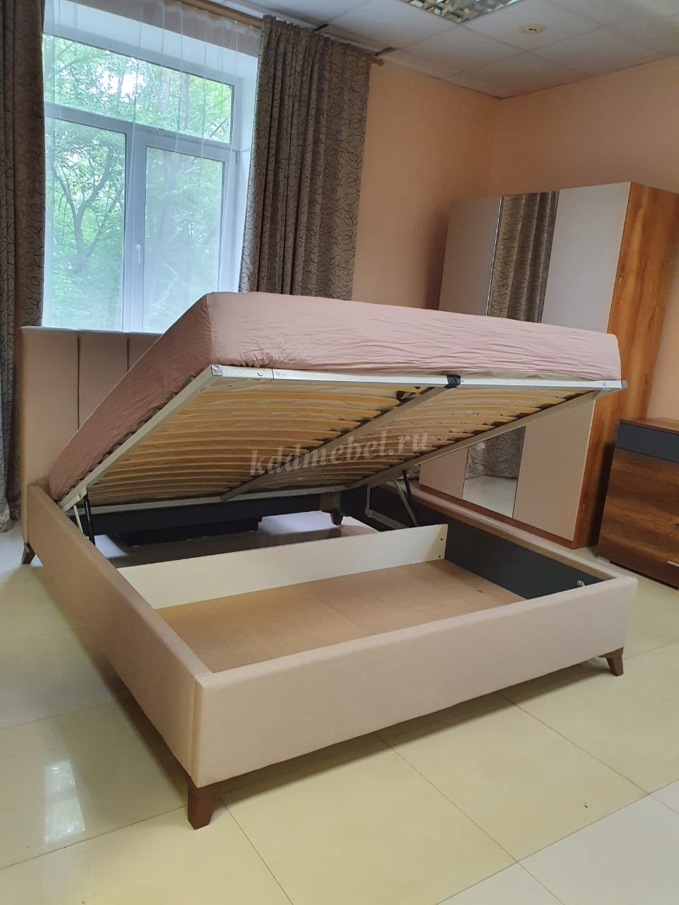 Кровать имеет большую нишу для хранения вещей, куда можно положить что-угодно, без труда воспользовавшись подъёмным механизмом.
