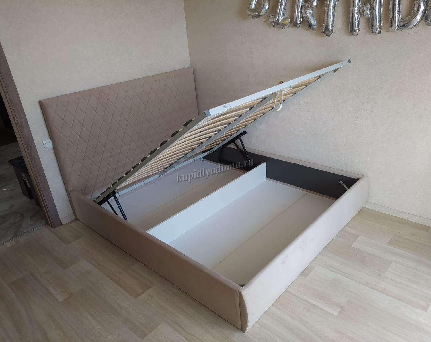 Кровать имеет большую нишу для хранения вещей, куда можно положить что-угодно, без труда воспользовавшись подъёмным механизмом.