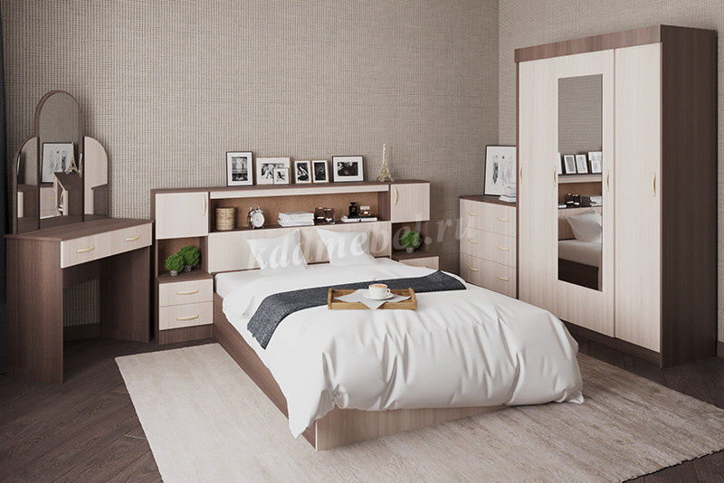 Комплект мебели для спальни "Басса" наполнит комнату уютом и теплом, сделав ее самой любимой комнатой в доме. Функциональные элементы, входящие в состав, позволяют создать удобную обстановку. При желании комплект можно дополнить другими элементами серии. Лаконичный гарнитур для оформления современной спальни принесет особое настроения в ваш дом. Спальный гарнитур выгодно подчеркнет обстановку, подарив ей нотки роскоши и уюта. Великолепно подобранное сочетание модулей принесет в абсолютно каждый интерьер функциональность и изысканность. Классическое исполнение спального гарнитура , выполненного в сочетании контрастных оттенков, понравится любителям простых форм в оформлении интерьера.