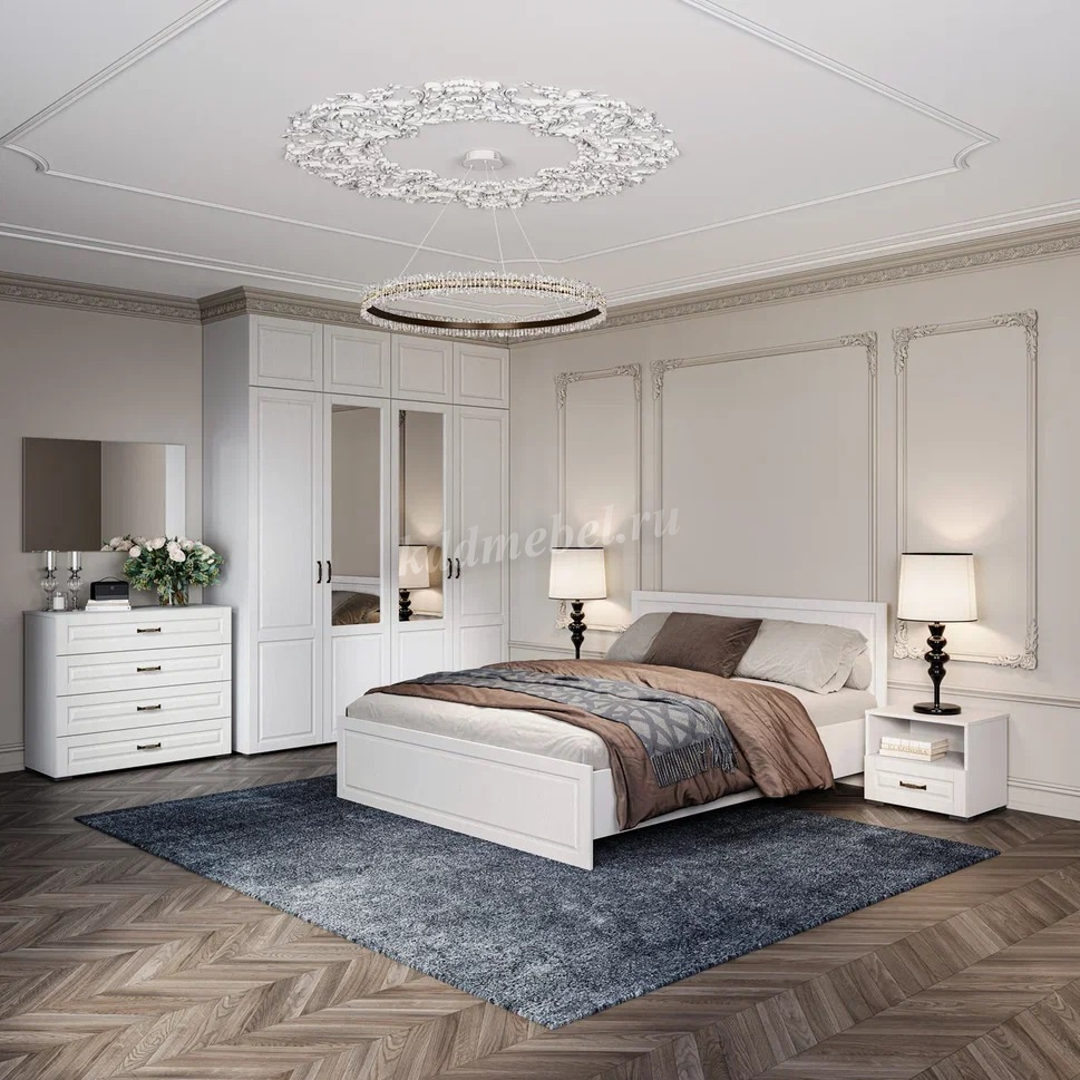 В спальне, как и во всей системе Лацио, корпус выполнен из ЛДСП в цвете белое дерево с имитацией текстуры дерева, фасад МДФ – белое дерево с текстурой.