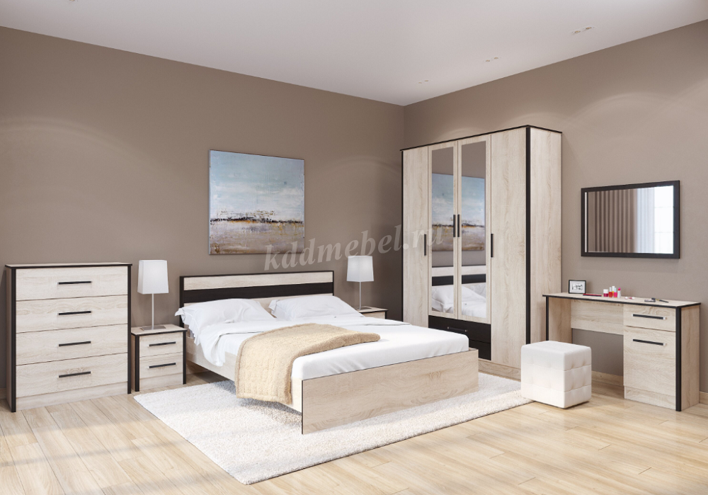 Серия комплектуется вместительым 4-створчатым шкафом с выдвижными ящиками.