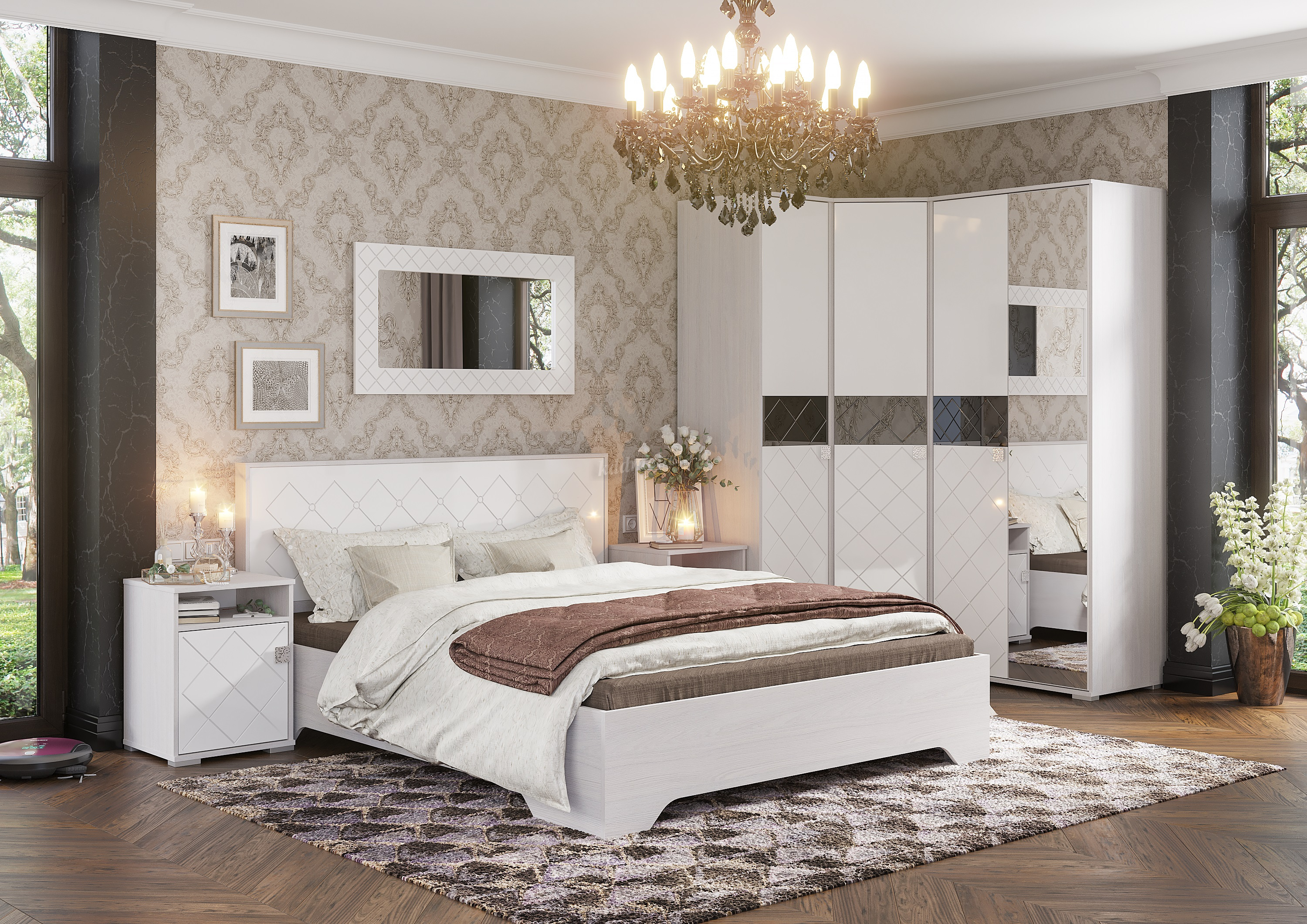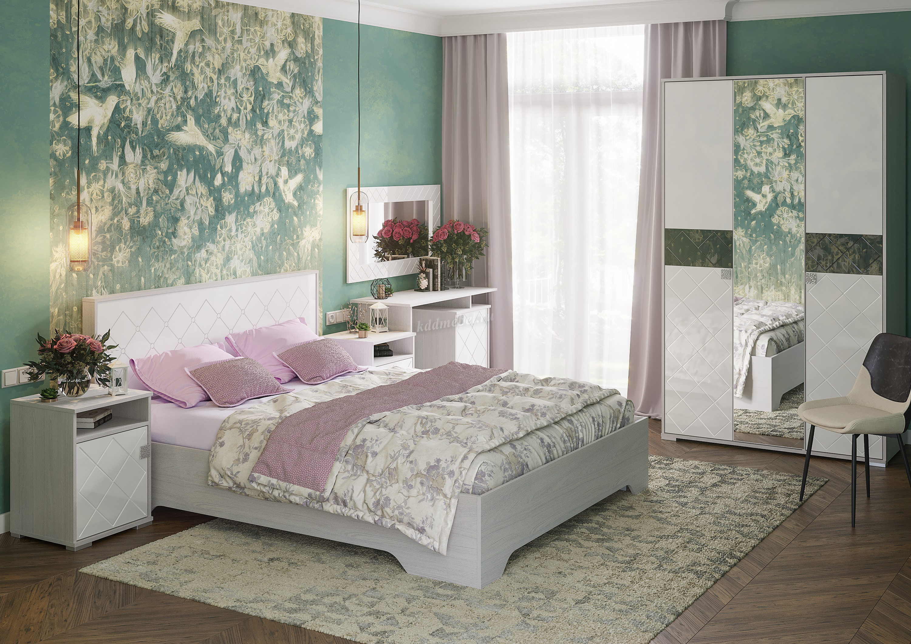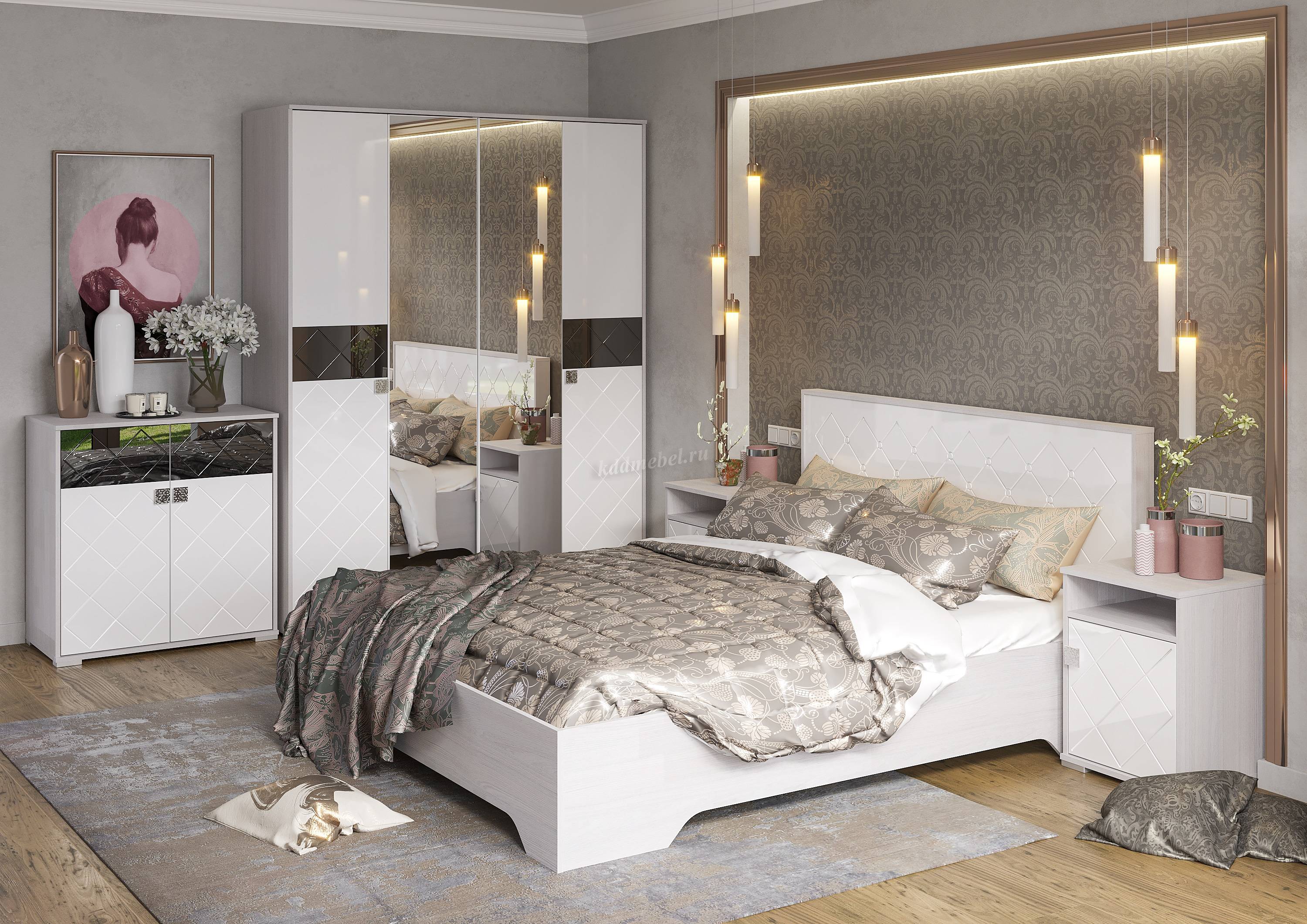 Обволакивающий цвет декора белый глянец светлый наполнит спальню уютом и чистотой, настраивая на отдых, в то время как текстура натурального дерева привнесет в неё умиротворение и спокойствие. Простые формы, четкие линии и декоративные элементы делают спальну Сальма поистине изящной.