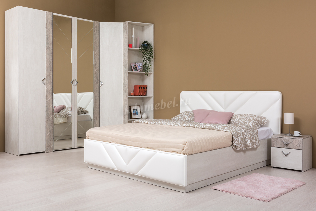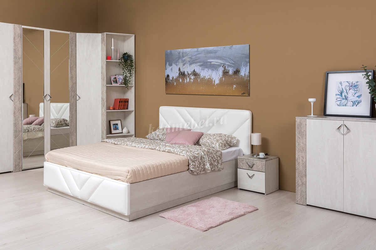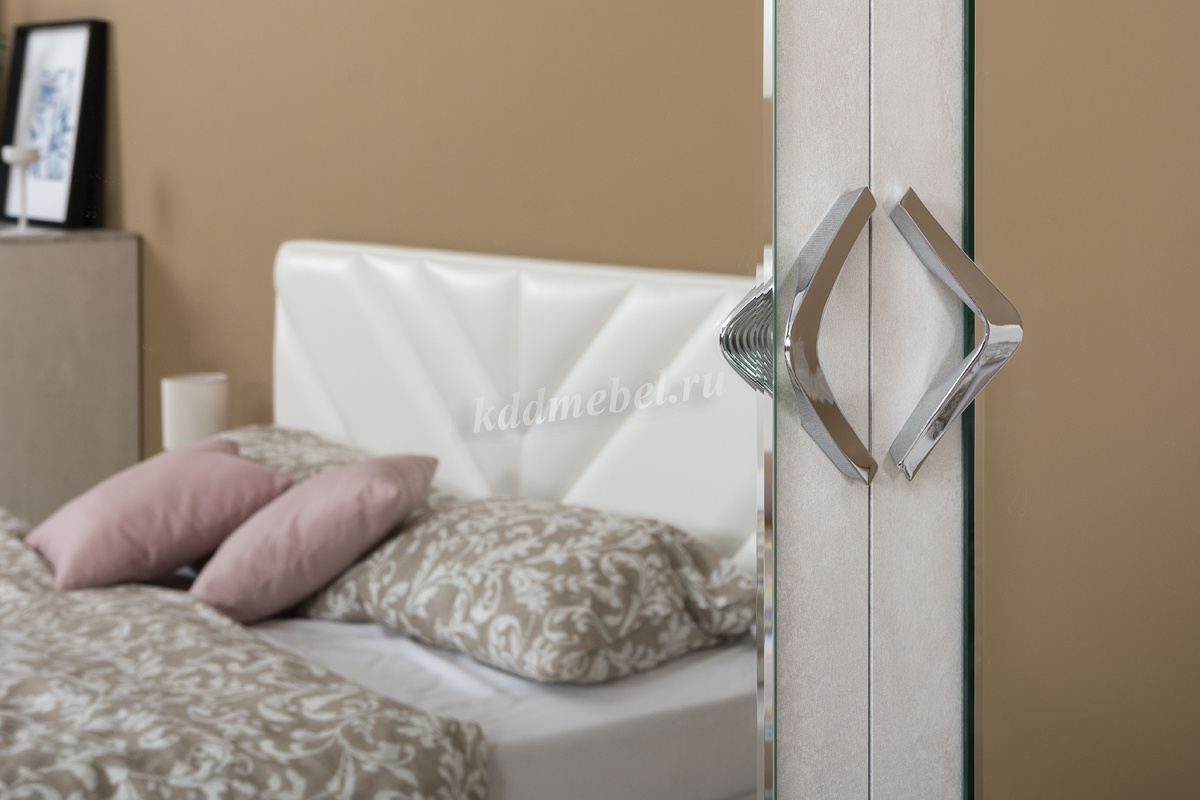 Амели спальня в стиле ар-деко. Она роскошна и сдержанна одновременно. Спокойная цветовая гамма, с имитацией фактуры шелковой ткани и камня, подойдет во многие интерьеры. Максимально высокая шкафная группа обеспечивает большое пространство для хранения. Фрезеровка на МДФ деталях и зеркалах подчеркивает форму ручек. Металлические ручки цвета никель приятны тактильно и удобны при открывании фасадов, за счет ребристой поверхности с обратной стороны.