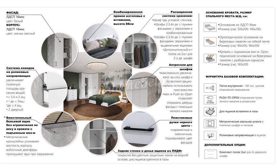 "Чикаго" - это сочетание минималистичного дизайна, комфорта и функциональности. Выигрышные комбинации свежих нейтральных оттенков создают воздушную атмосферу и позволяют легко менять интерьер. Множество модулей в едином стиле создают систему хранения и освобождают пространство.