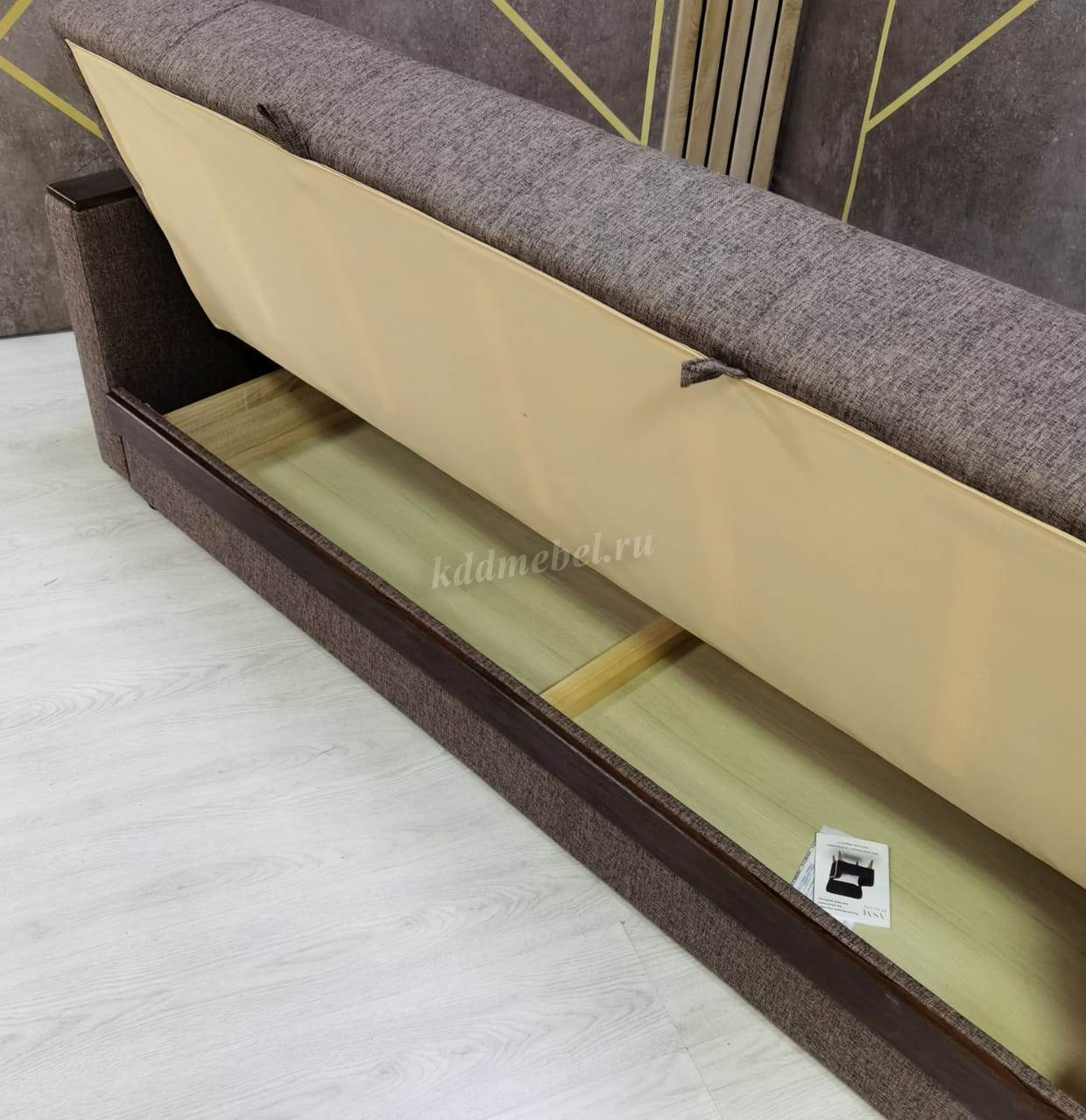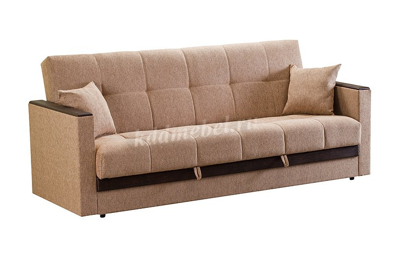 При трансформации требуется расстояние между диваном и стеной. Мебель является пристенной. Механизм «Книжка» прост и надежен в эксплуатации. Напольное покрытие в процессе раскладки не задействовано, Вы можете использовать пушистые ковры или дорогие паркеты. Емкость для хранения постельных принадлежностей с ламинированным основанием обеспечит Вам дополнительное пространство для хранения и сэкономит Ваше время при подготовке дивана ко сну. Ламинированное основание обеспечит простоту и удобство при уборке. Декоративные накладки из МДФ на подлокотниках и передней части короба, сочетают в себе представительность и элегантность, придают изящность дизайну