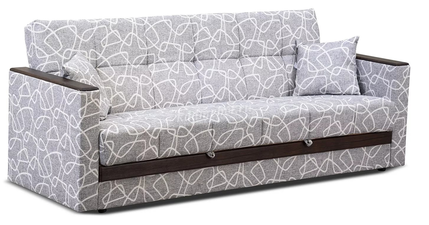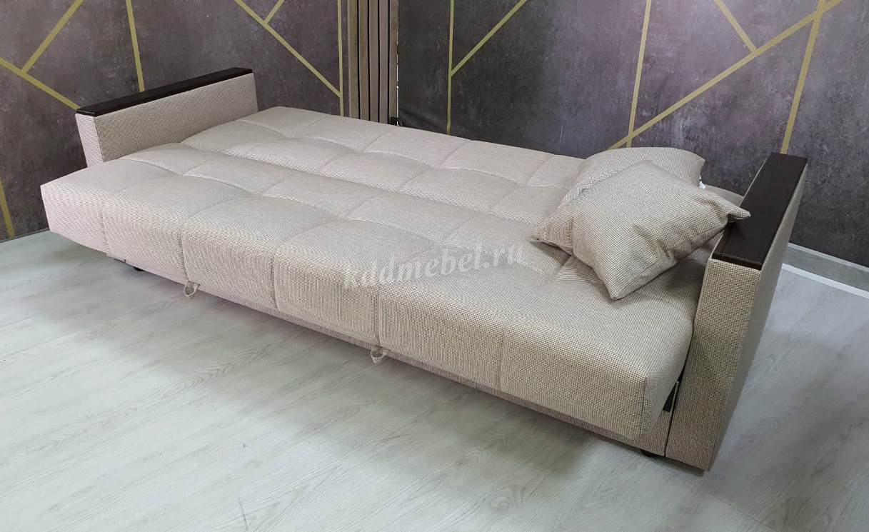 При трансформации требуется расстояние между диваном и стеной. Мебель является пристенной. Механизм «Книжка» прост и надежен в эксплуатации. Напольное покрытие в процессе раскладки не задействовано, Вы можете использовать пушистые ковры или дорогие паркеты. Емкость для хранения постельных принадлежностей с ламинированным основанием обеспечит Вам дополнительное пространство для хранения и сэкономит Ваше время при подготовке дивана ко сну. Ламинированное основание обеспечит простоту и удобство при уборке. Декоративные накладки из МДФ на подлокотниках и передней части короба, сочетают в себе представительность и элегантность, придают изящность дизайну