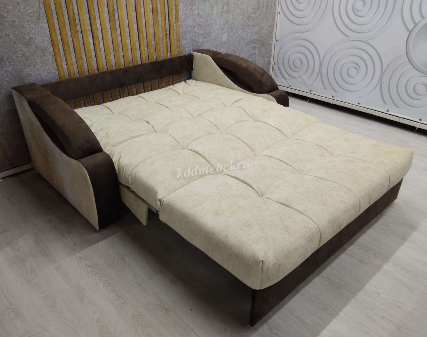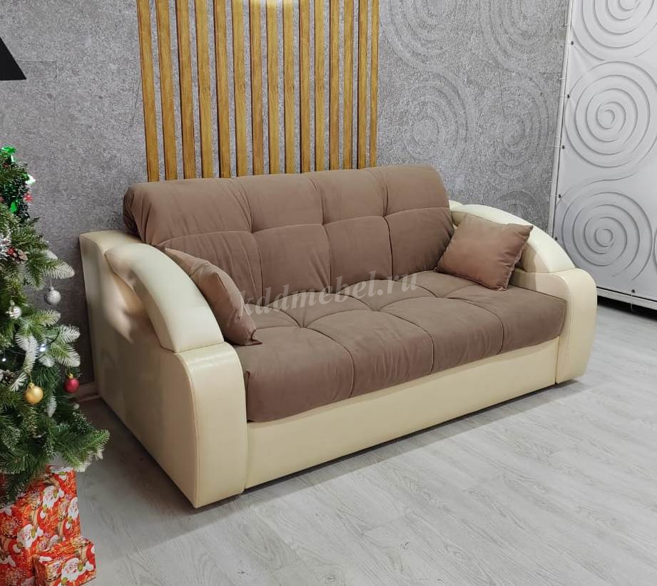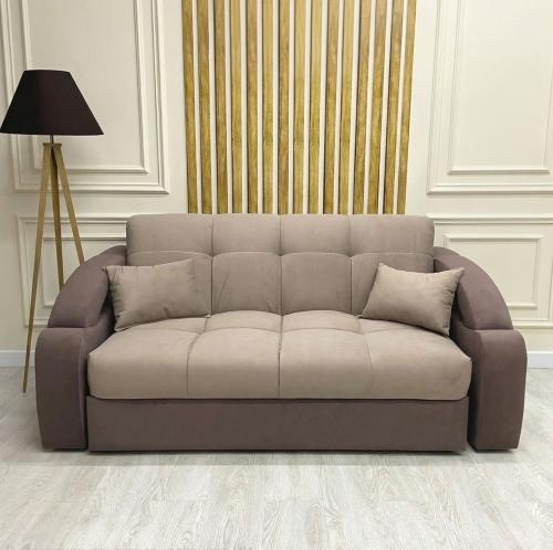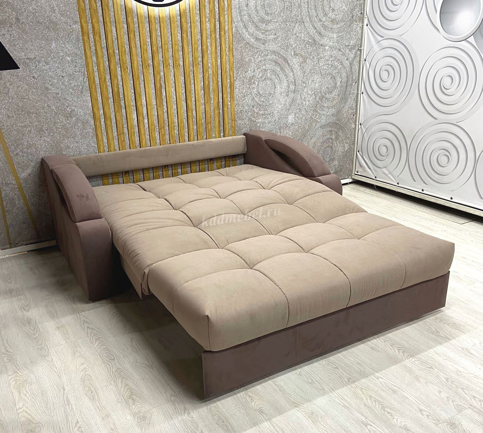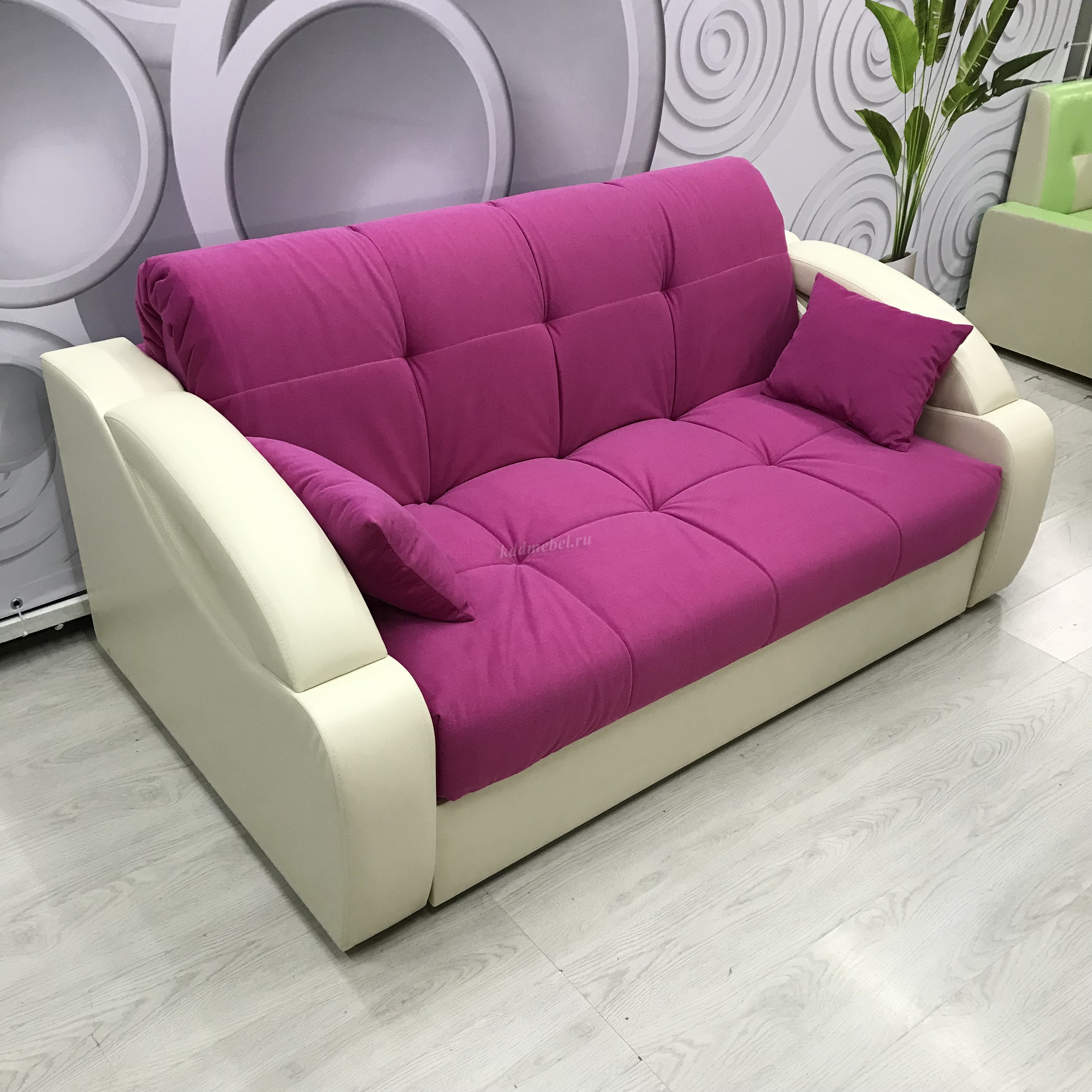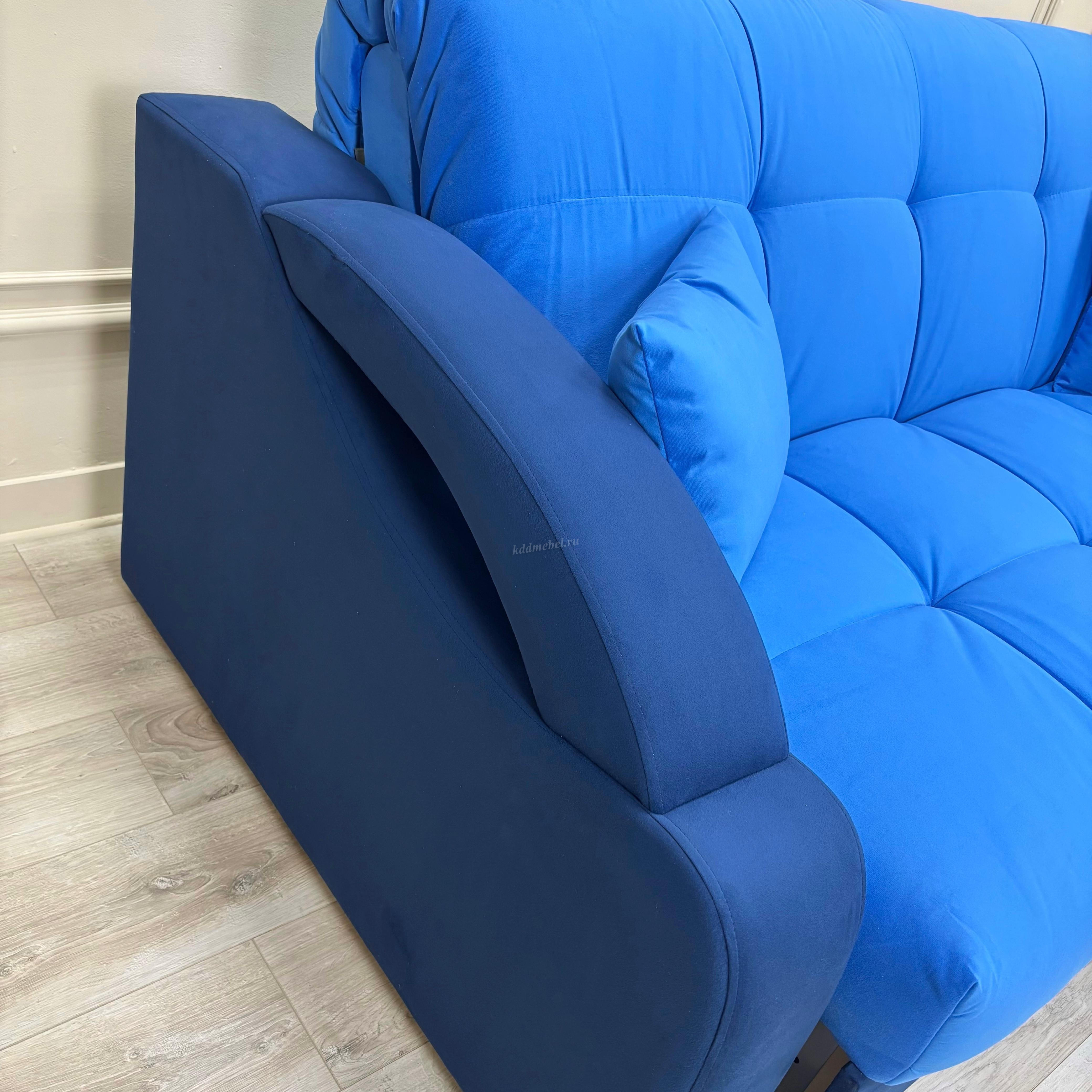 Стильный современный диван. Мягкие дугообразные подлокотники. Ровное спальное место. Возможность использования в качестве центрального объекта интерьера. В основании спального места металлический каркас с поддерживающими деревянными латами и механизмом трансформации «аккордеон». Матрас на эластичном ППУ. Съемный чехол спального места. Спальное место формируется следующим образом: цокольная часть сиденья выдвигается вперед до упора, спинка, состоящая из сложенного листового пенополиуретана, раскладывается. Для трансформирования не требуется расстояние между стеной и диваном. На фото показана модель дивана, расцветку возможно сделать под заказ или выбрать по наличию на складе. Цена может меняться в большую или меньшую сторону, в зависимости от ткани.