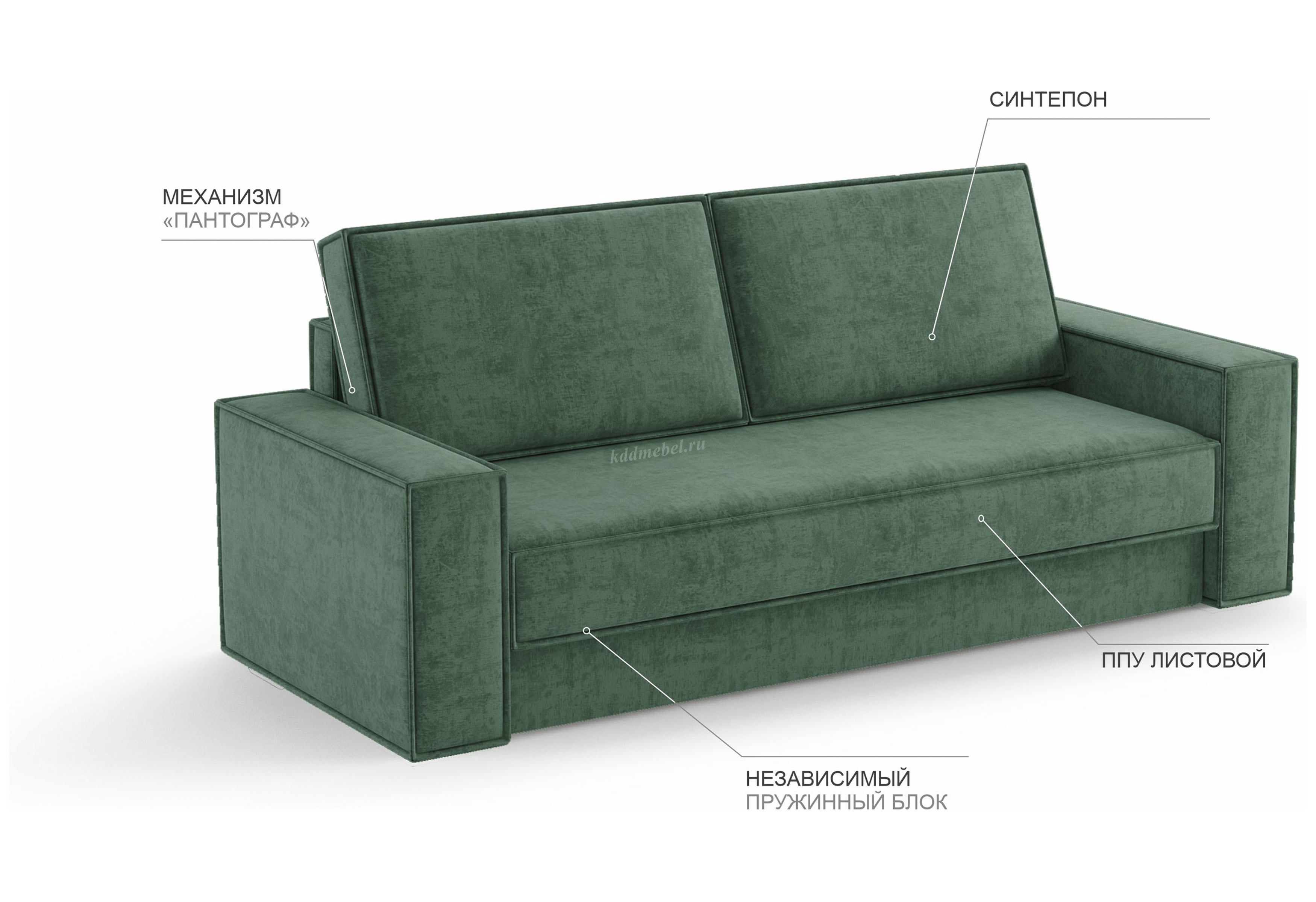 Механизм «Пантограф» отличается простой и удобной системой раскладывания. Для трансформации из положения «диван» в положение «кровать» необходимо приподнять сидение дивана и потянуть на себя, после чего просто опустить спинку.