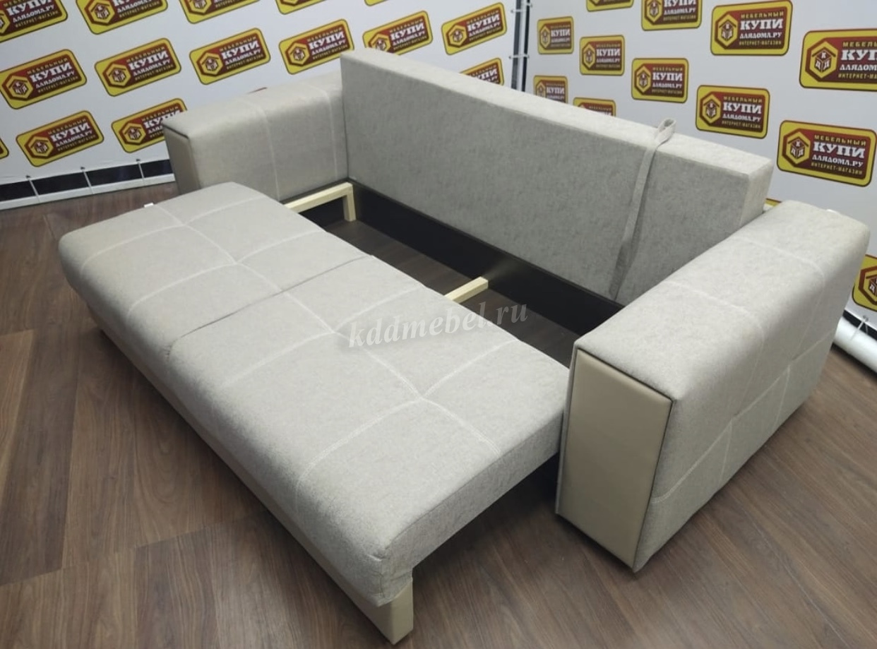 При трансформации может находиться вплотную к стене. ППУ и пружины «змейка» в основании дивана обеспечивают максимальный комфорт. Вместительный бельевой ящик из ЛДСП позволяет сэкономить место на хранении постельных принадлежностей. Высота посадочного места: 450 мм. Возможно 2 варианта кроя.