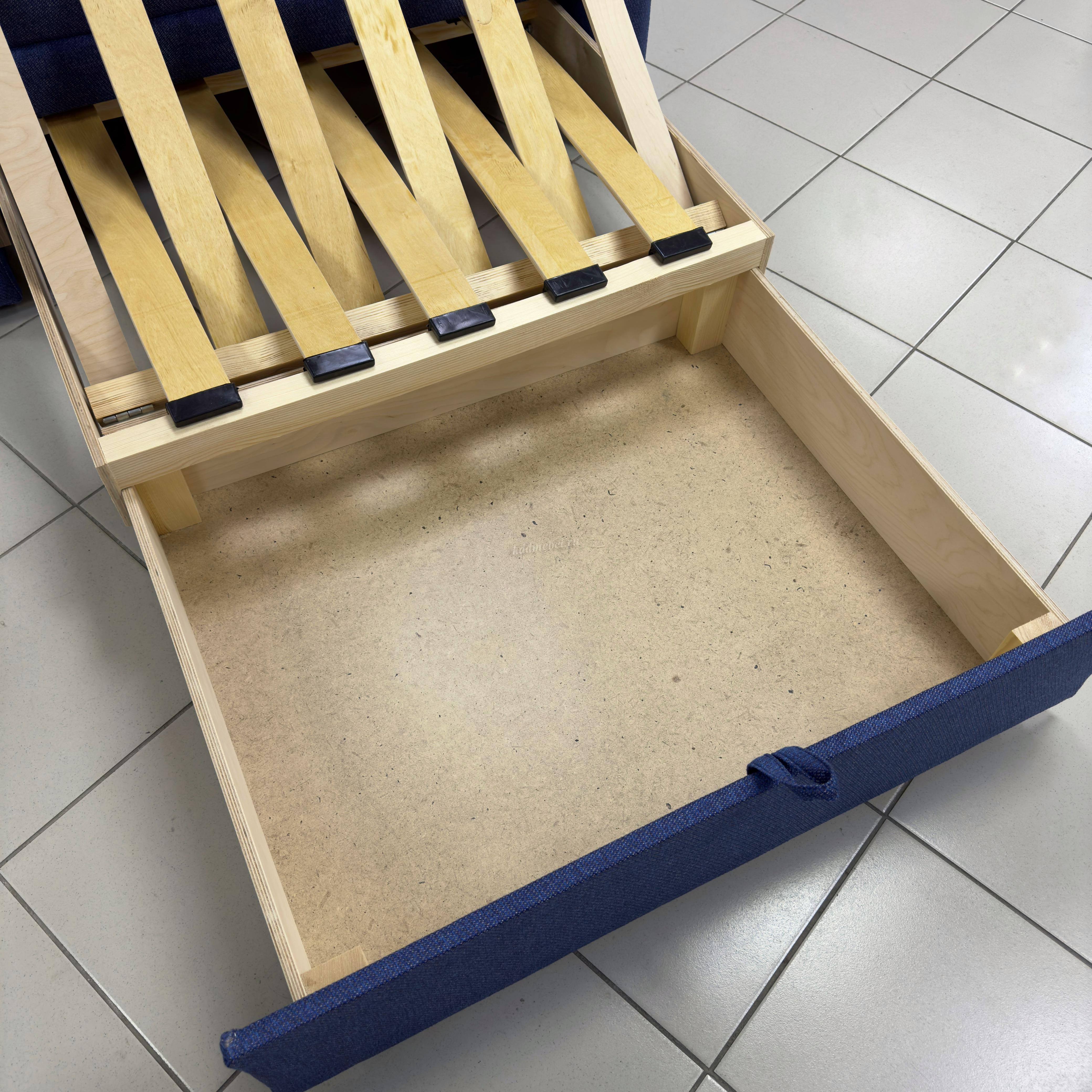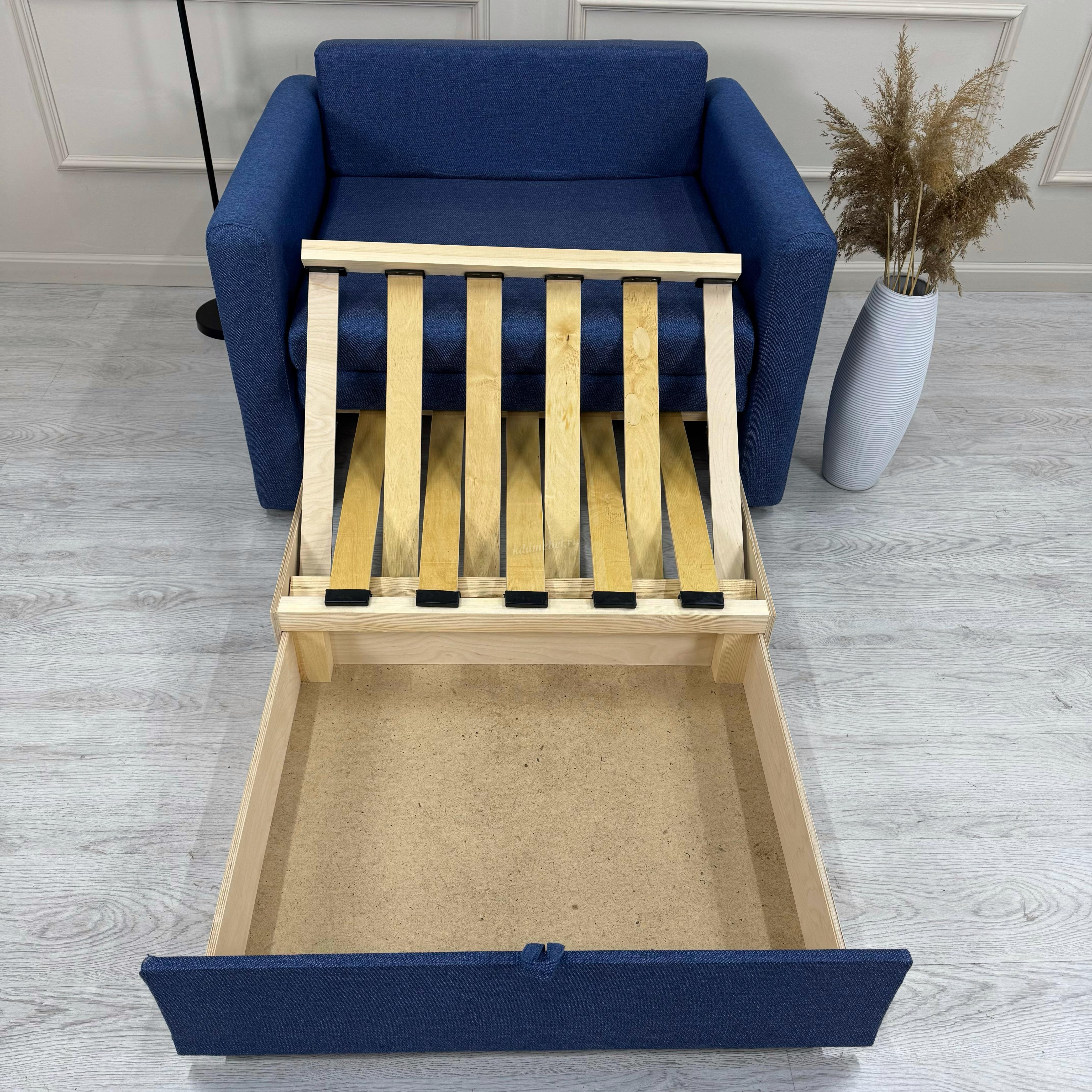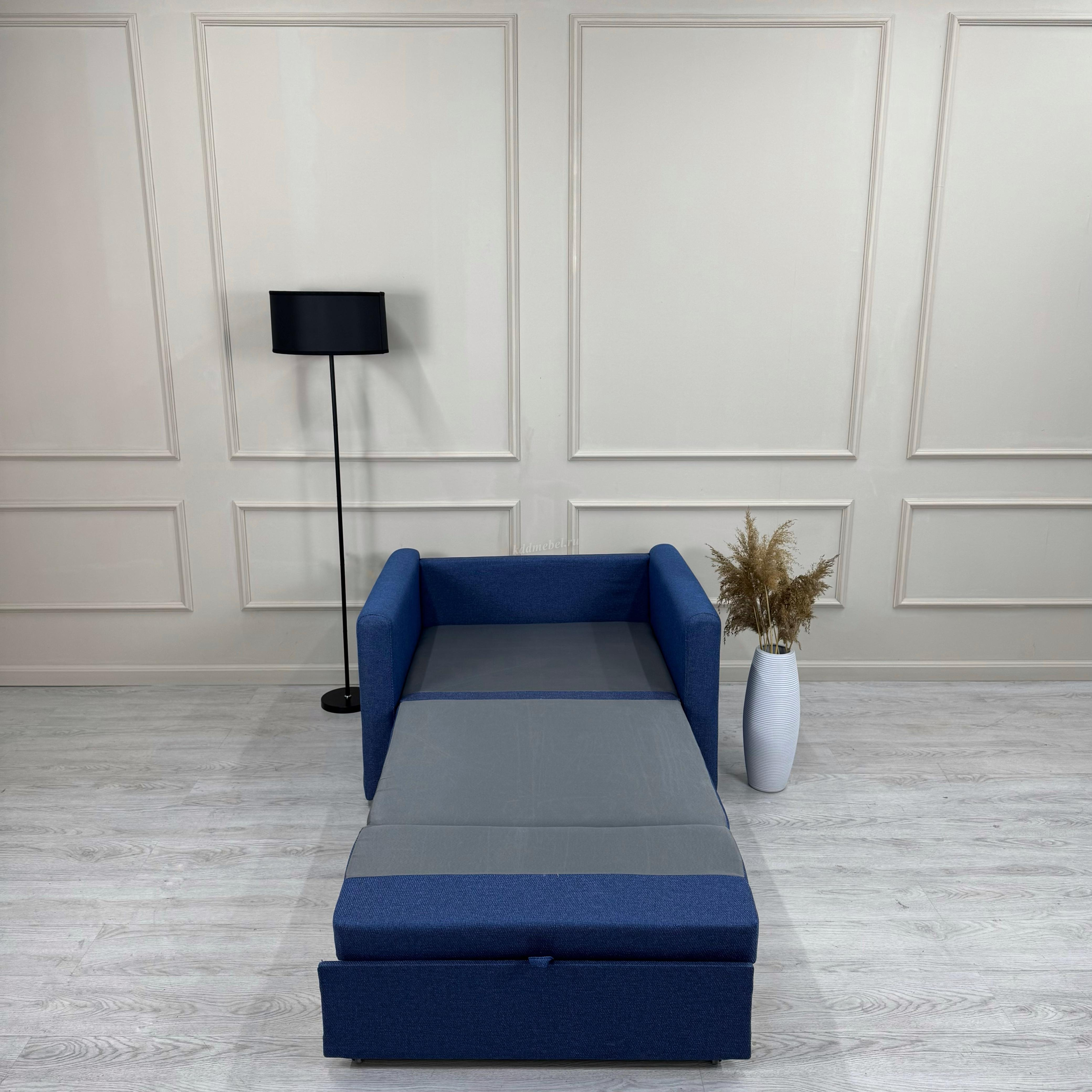 Двух местный диван-кровать. Может использоваться, как центральный объект интерьера, при условии дополнительного заказа задника из обивочной ткани. Механизм трансформации «Выкатной». Механизм трансформации «Выкатной» прост в применении и долговечен, так как рассчитан на частое использование. Данный механизм позволяет получать диван небольших размеров в собранном виде и внушительное спальное место в разобранном. Подготовить спальное место ко сну сможет даже ребенок. Диван можно ставить вплотную к стене, что позволяет сэкономить место в комнате. Бельевой ящик: Фанера 730х620х130 (мм).