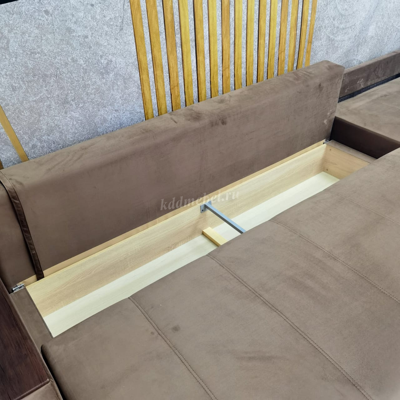 При трансформации диван находится вплотную к стене, раскладка производится в переднем направлении.