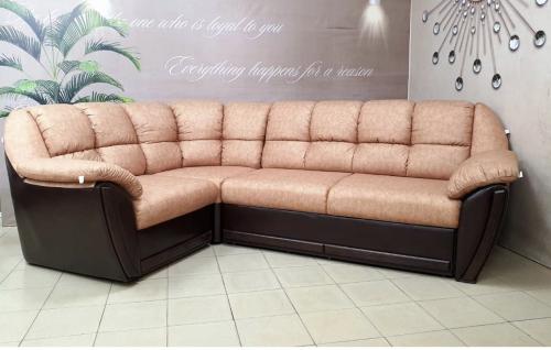 Возможно использовать как центральный объект интерьера при условии дополнительного заказа задников из обивочной ткани. Угловой диван общего типа. Механизм трансформация «Дельфин». Направление угла универсальное, сборка производится без инструмента. Наполнение: спинка из мягкого эластичного ППУ 20; спальное место состоит из четырех элементов: сиденья дивана, элемента сектора, приставного кресла и рамы механизма «дельфин». Обивка: в двух тканях (1 -сиденье, спинка; 2 - нижняя часть каркаса) Возможность изготовления в кожзаме. Жесткость спального места упругая. Состав: слой ППУ 28 на упругом основании типа «змейка». В стандартной комплектации задняя стенка не из обивочной ткани.