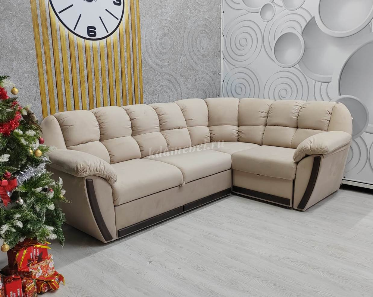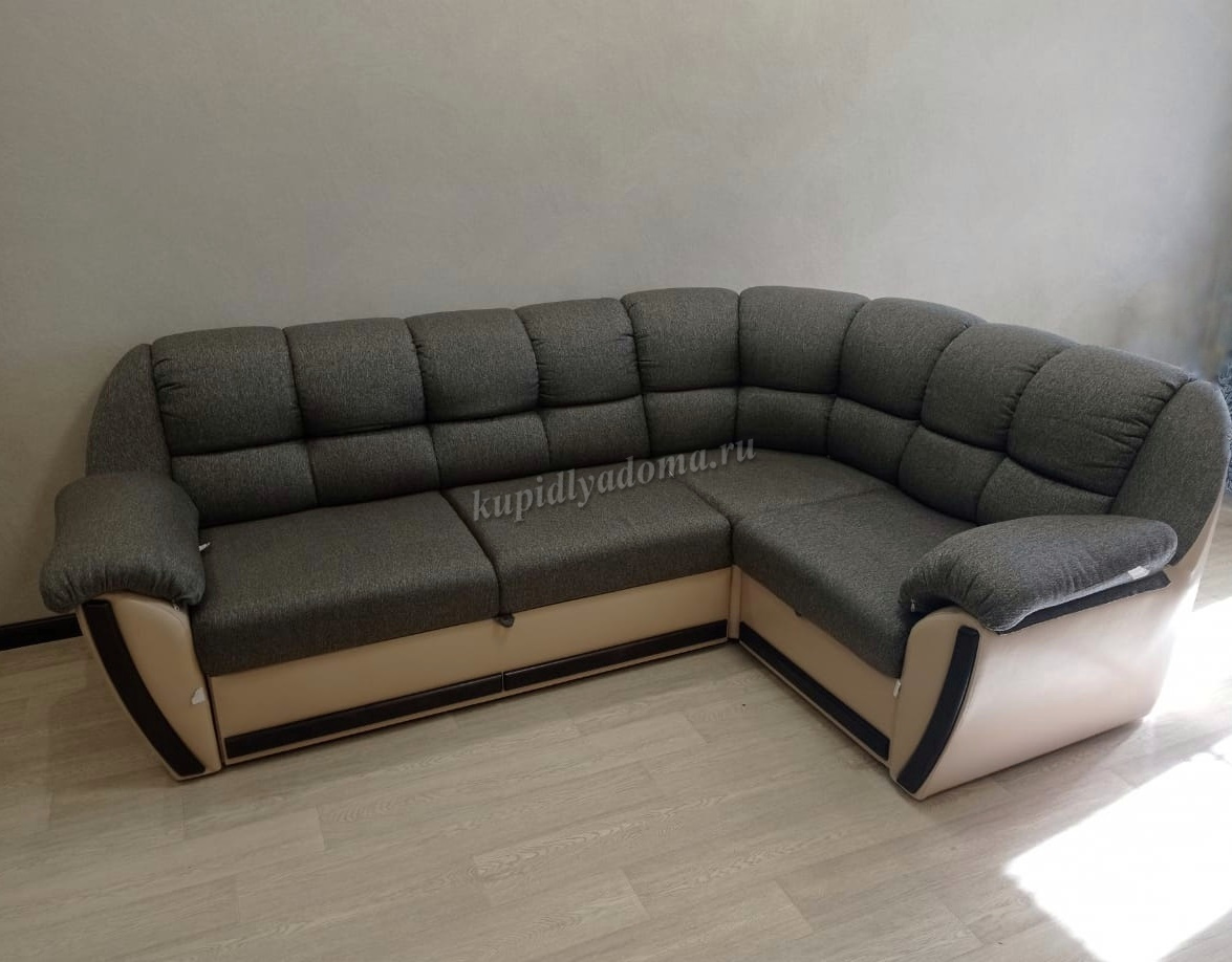 -Матрас на эластичном ППУ. -Бельевой ламенированный ящик. -Декоративные накладки. -возможно использовать как центральный объект интерьера при условии дополнительного заказа задников из обивочной ткани. Угловой диван общего типа. Механизм трансформация «Дельфин». Направление угла универсальное, сборка производится без инструмента. Наполнение: спинка из мягкого эластичного ППУ 20; спальное место состоит из четырех элементов: сиденья дивана, элемента сектора, приставного кресла и рамы механизма «дельфин». Обивка: в двух тканях (1 -сиденье, спинка; 2 - нижняя часть каркаса) Возможность изготовления в кожзаме. Жесткость спального места упругая. Состав: слой ППУ 28 на упругом основании типа «змейка». В стандартной комплектации задняя стенка не из обивочной ткани.