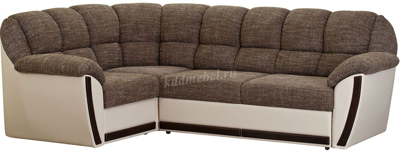 Возможно использовать как центральный объект интерьера при условии дополнительного заказа задников из обивочной ткани. Угловой диван общего типа. Механизм трансформация «Дельфин». Направление угла универсальное, сборка производится без инструмента. Наполнение: спинка из мягкого эластичного ППУ 20; спальное место состоит из четырех элементов: сиденья дивана, элемента сектора, приставного кресла и рамы механизма «дельфин». Обивка: в двух тканях (1 -сиденье, спинка; 2 - нижняя часть каркаса) Возможность изготовления в кожзаме. Жесткость спального места упругая. Состав: слой ППУ 28 на упругом основании типа «змейка». В стандартной комплектации задняя стенка не из обивочной ткани.