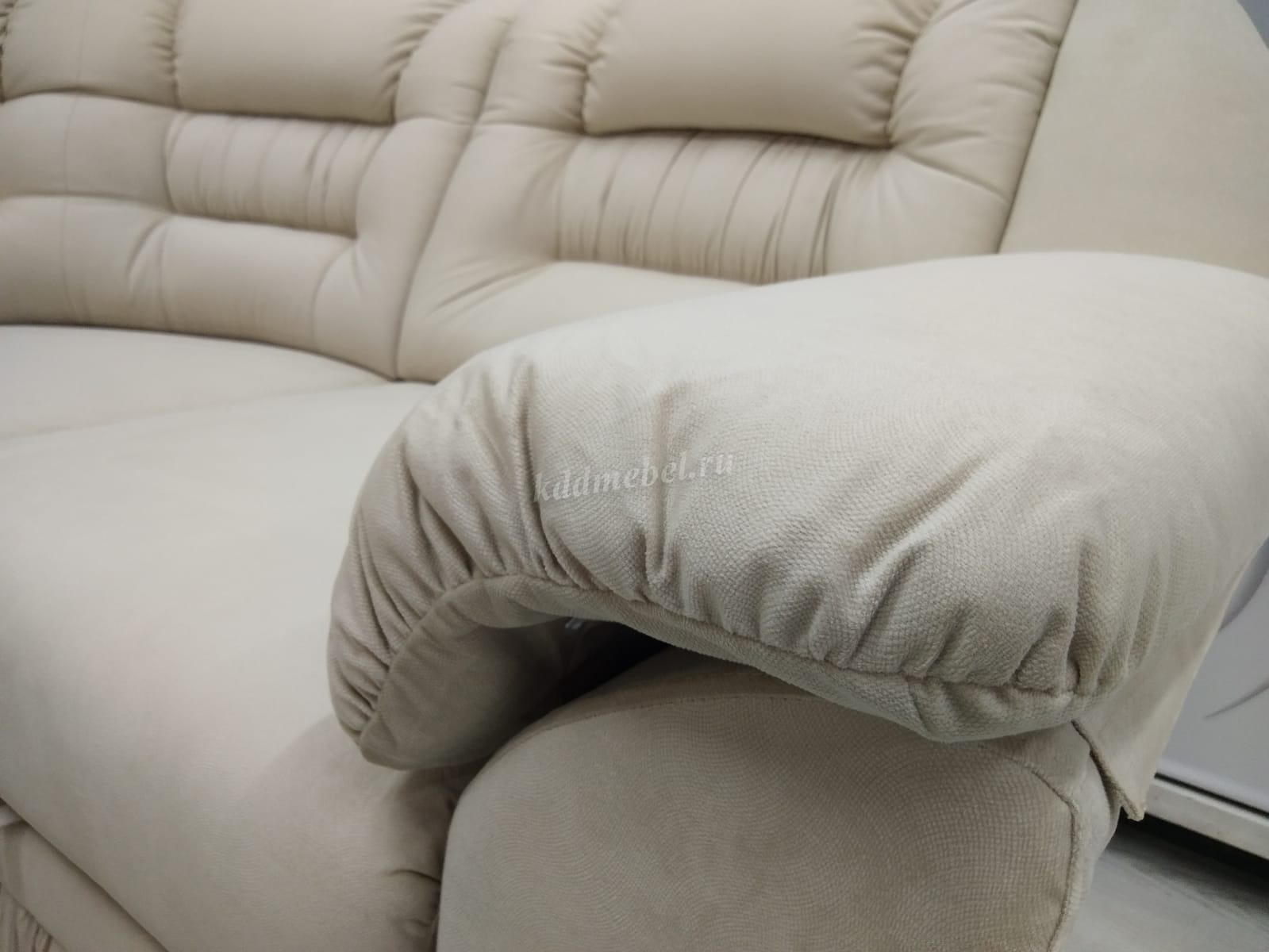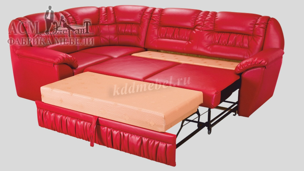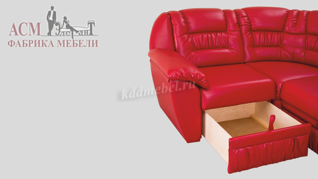 Угловой диван габаритного типа. Направление угла универсальное, сборка производится без инструмента. Состав модели. Диван с механизмом «акнар» – 1шт. Приставное кресло с емкостью и подъемным механизмом - 1 шт. Съемная подушка на подлокотнике – 2шт. Наполнение: спинка из упругого эластичного ППУ 22; спальное место состоит из трех элементов сиденья дивана, подголовника и рамы механизма «акнар». Обвивка ткани: в одной или двух тканях (1 – сиденье, спинка; 2 - нижняя часть каркаса). Возможно полностью в кожзаме. Жесткость спального места среднее. Состав: слой ППУ 28 плотности на упругом основании посадочного места типа «змейка», исключение рама «акнар». Емкость для вещей из ДСтП и ДВП.