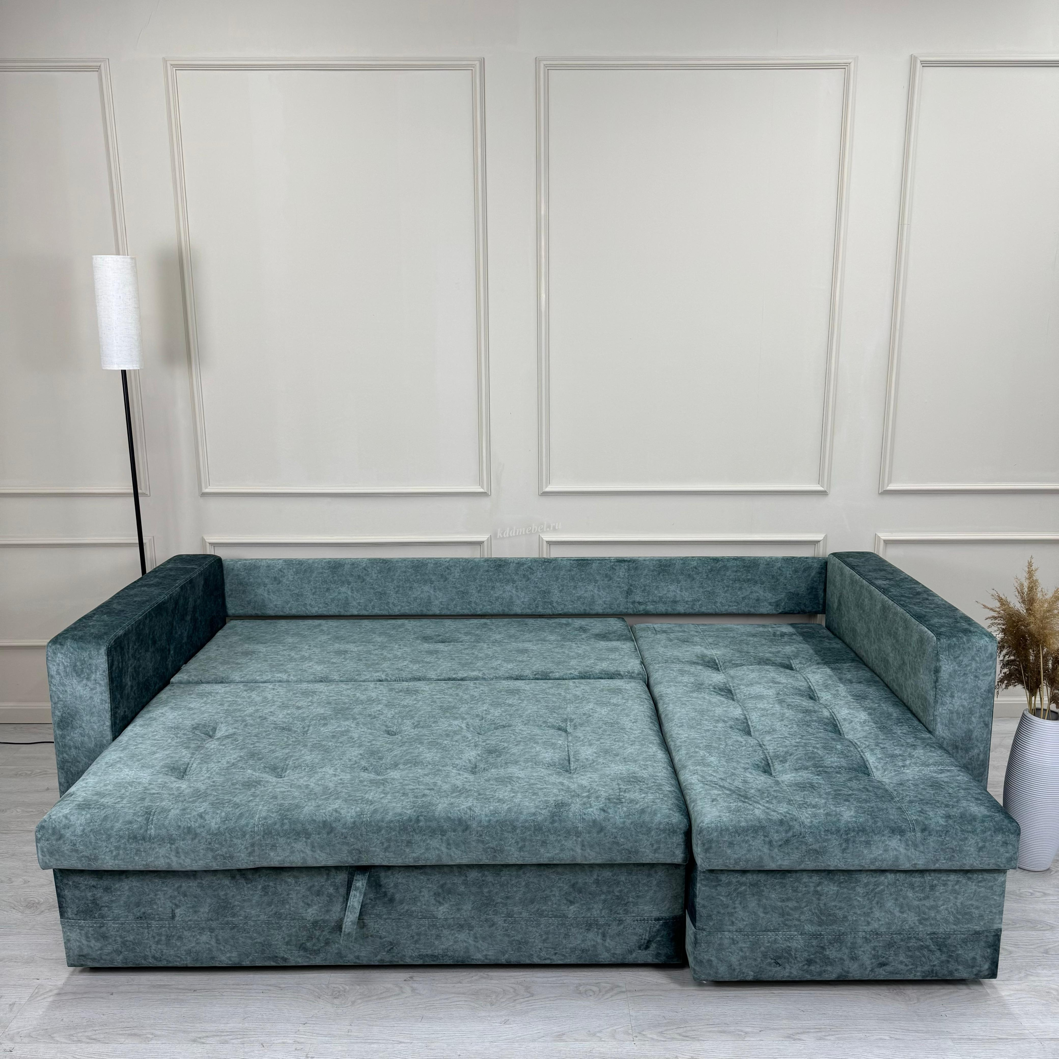 Изделие имеет металлический каркас и внешнюю отделку из высококачественного и приятного на ощупь велюра в цвете морская волна.