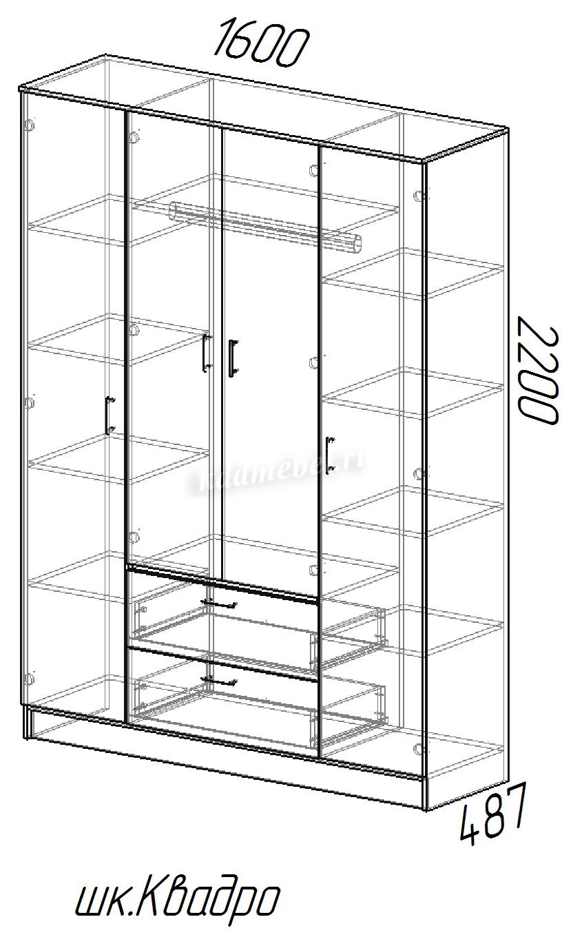 За крайними дверцами (слева и справа) у шкафа Квадро находятся полочки для белья либо других Ваших вещей;