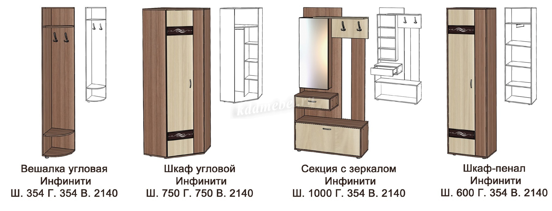 Модульная серия мебели для прихожей Инфинити состоит из четырёх модулей, что позволяет создать множество композиций.