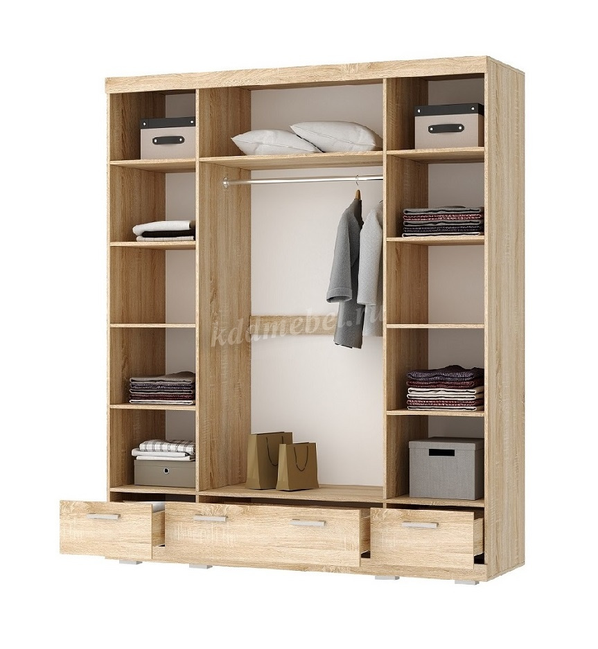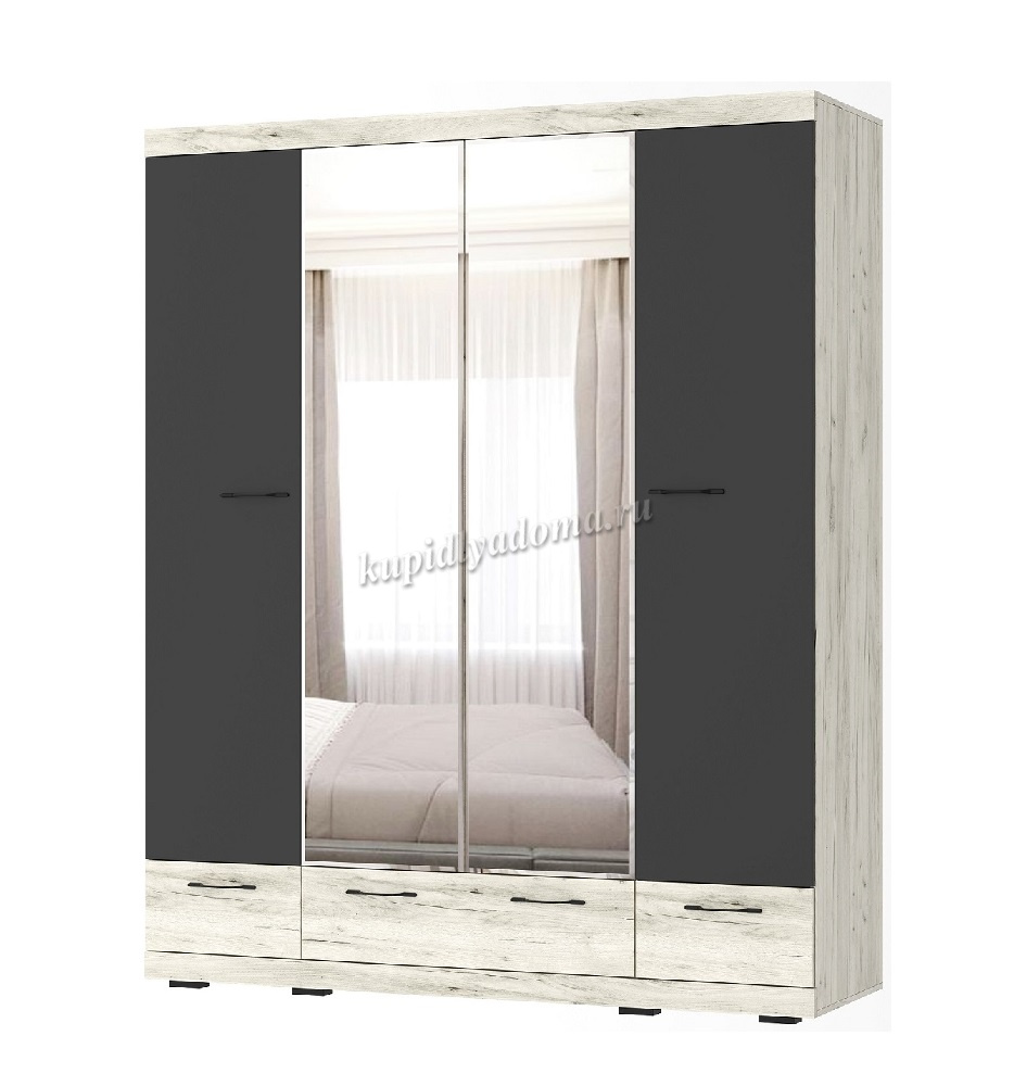 Шкаф "СОНАТА" ШСЗ-1800 четырёхстворчатый с зеркалами, с полками, металлической штангой штангой для верхней одежды и тремя ящиками на направляющих полного выдвижения. Верхняя и нижняя части шкафа обрамлёны профилем MDF. Зеркала выполнены с изящной и красивой обработкой "фацет" по периметру.