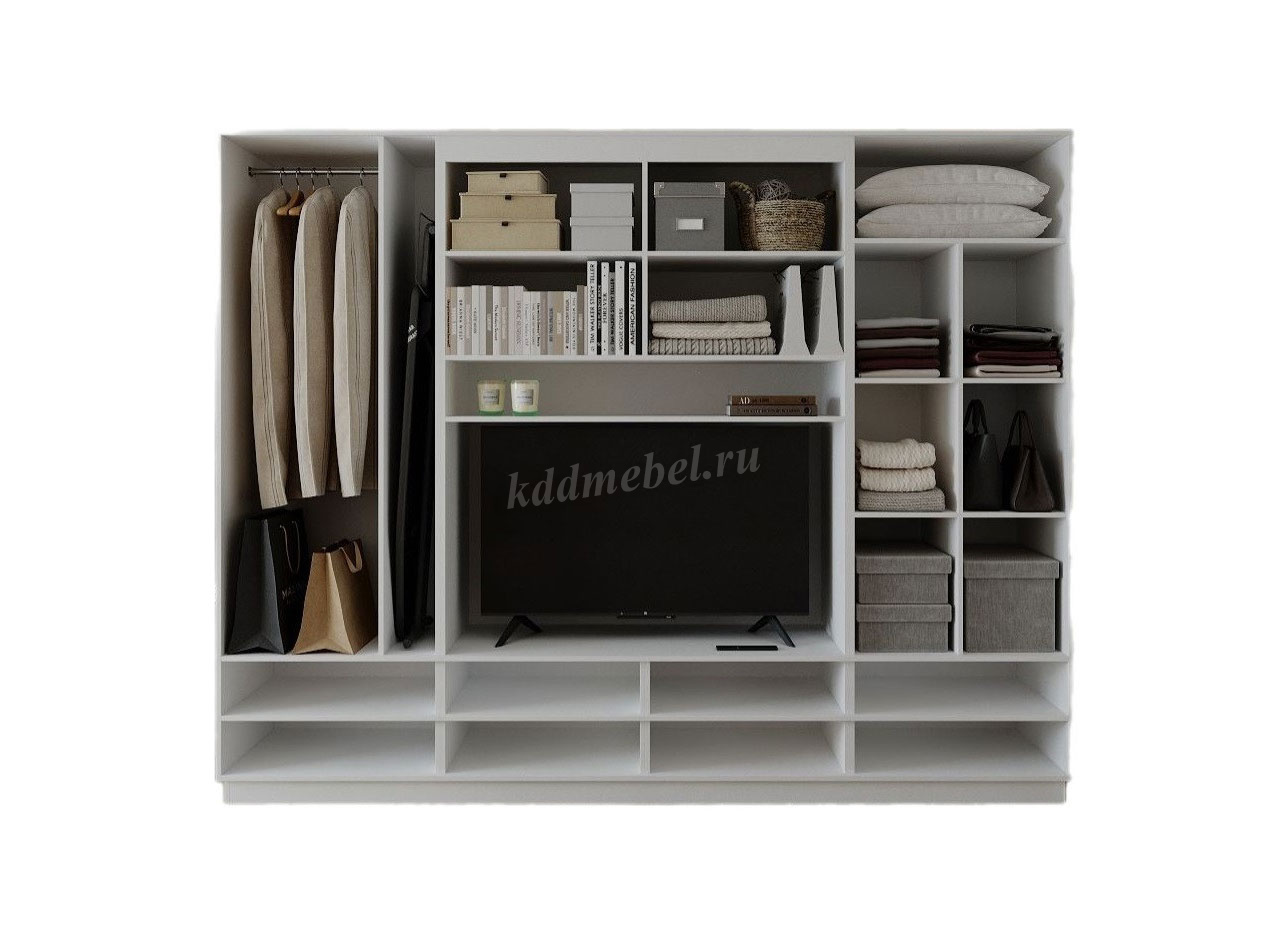 Отдельные секции с вешалками, полками, выдвижными ящиками и отдельной нишей под ТВ - это, пожалуй, лучшая идея для небольшой квартиры.