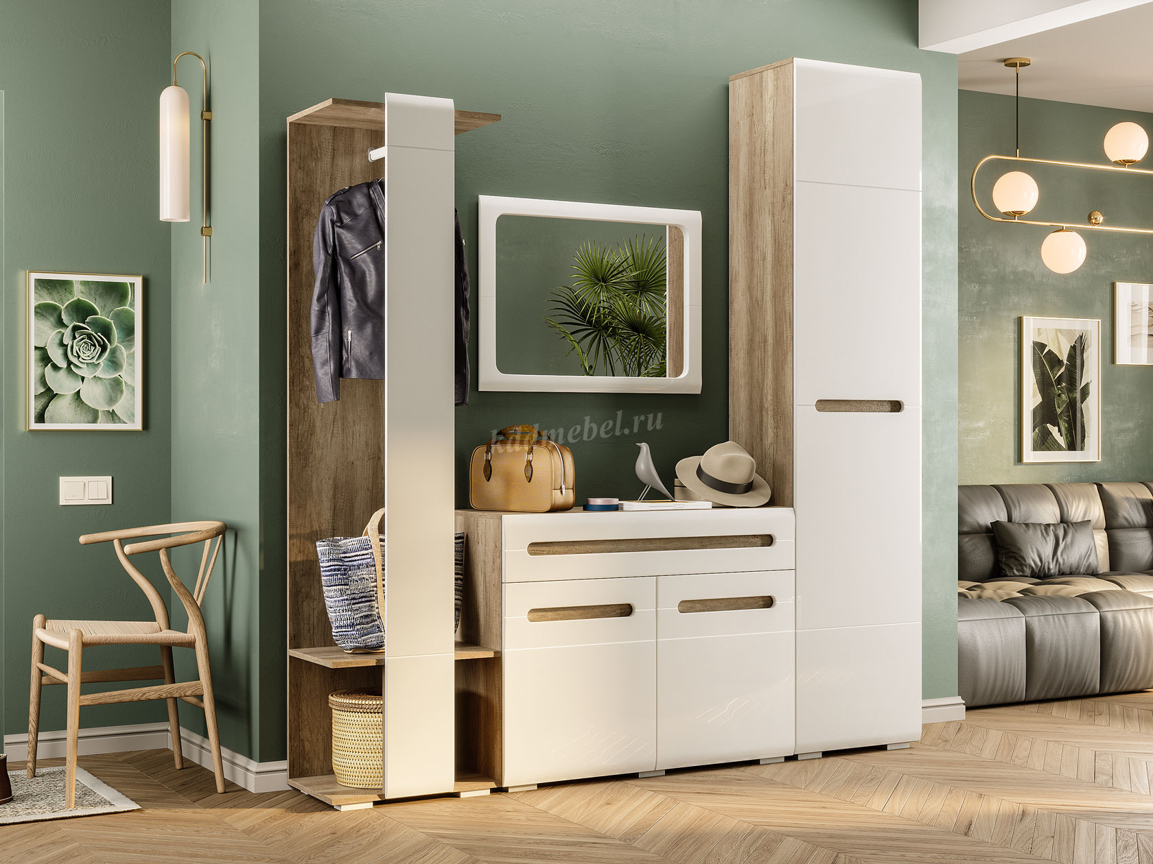 Модульная система Наоми - это свежий одухотворенный интерьер, наполненный светом, комфортом и функциональностью. Уникальная геометрия фрезерованных фасадов создает атмосферу ультра-современности и минимализма. Контрастность сочетания матового декора корпуса элитного дерева «Дуб Каньон» с безмятежно-белыми глянцевыми створками относит нас к спокойствию, экологичности и безмятежности. Оригинальное конструктивное решение коллекции – ручки фасадов, выполненные путем сложной фрезеровки и подчеркнутые углубленным декором дубового спила.