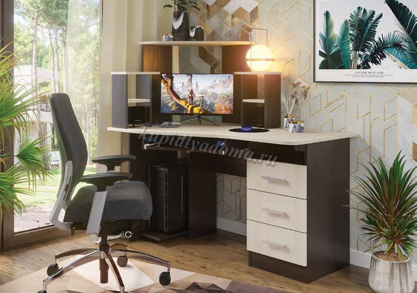 Удобный компьютерный стол №1 впишется в любой интерьер квартиры и офиса. Стол имеет три выдвижных ящика на роликовых направляющих, удобные полки под диски и различные мелочи. Полка под принтер и место под системный блок. А самое главное в небольшой квартире стол можно использовать как письменный, столешница на 1300 позволит удобно разместится на рабочем месте.