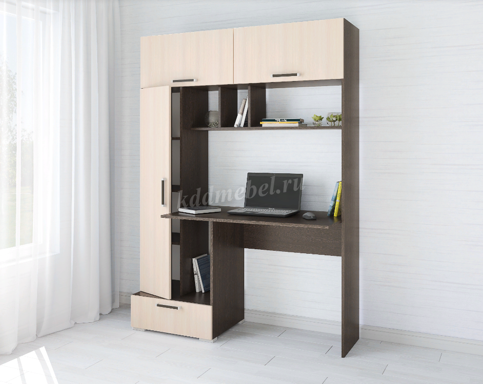 Стол компьютерный Квартет 11 поможет обустроить достаточно комфортное место, где вы с удовольствием сможете работать на компьютере или просто играть. Открытые полки пригодятся для размещения интересных и нужных книг, а также семейных фотографий и оригинальных статуэток. За распашными дверцами и в выдвижном ящике вы сможете хранить важные бумаги и документы. Широкая столешница позволит расположить все необходимое под рукой и спокойно выполнять задания.