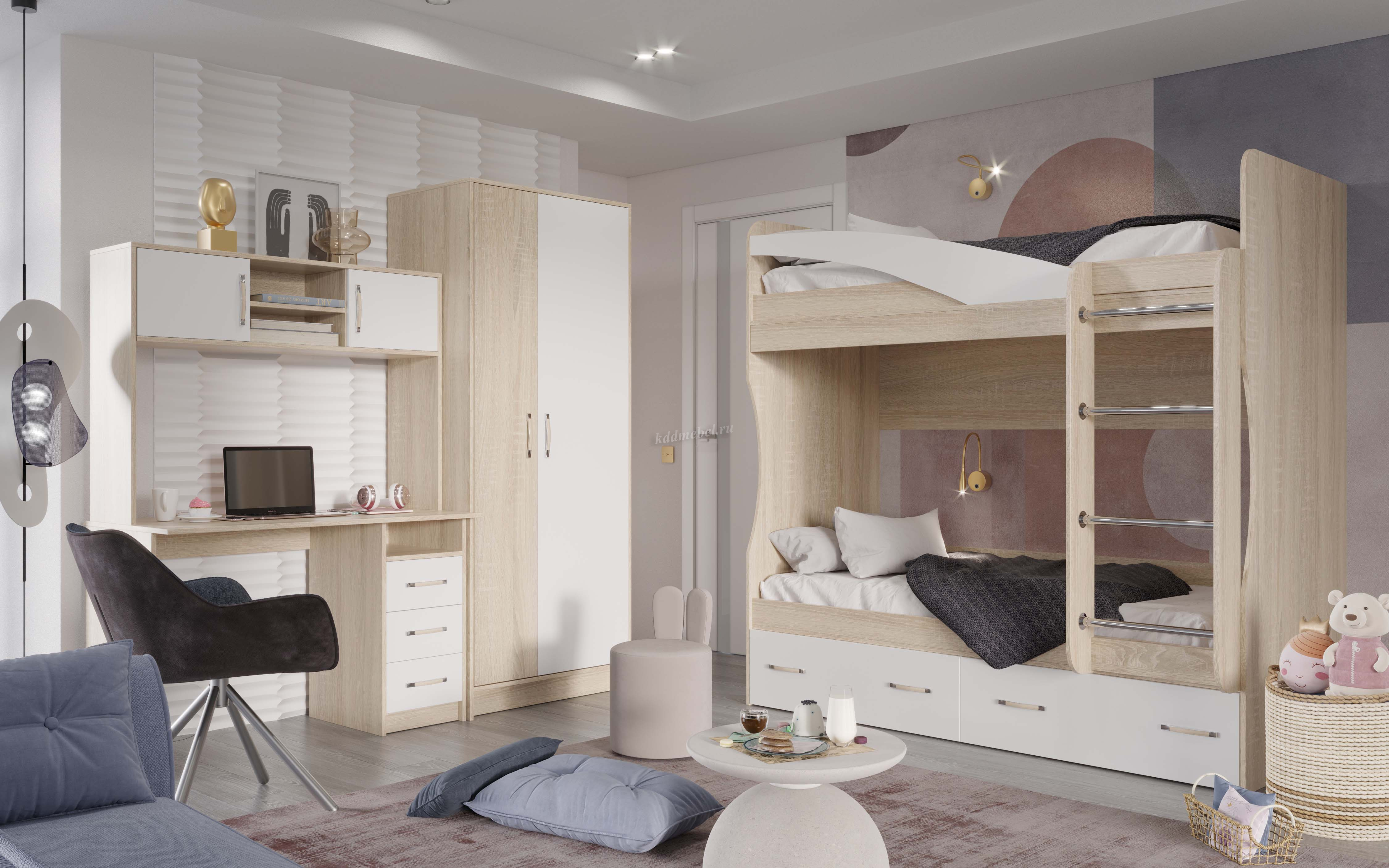 • Кровать двухъярусная Буратино (Дуб сонома/Белый)